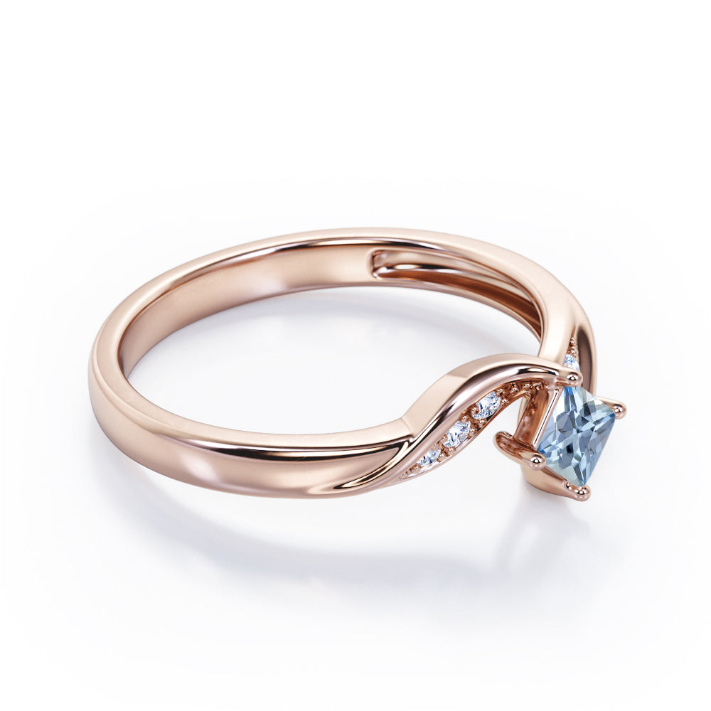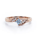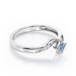 With 7 is believed to be a lucky number, this Twisted 7 Stone Ring - 0.55 carat Princess Moissanite and Diamond Elegant Engagement Ring in White Gold can be another good option to be a meaningful gift to your lover. The promise ring possesses a 0.5 carat princess cut Aquamarine along with three round Moissanite on each side of the band. Its shank is twisted and made parallel to each other, complementing the center stone very well. This classic Moissanite ring can be made in 18k gold over silver, 10k gold and 14k gold with the color of white gold, rose gold, yellow gold and black gold.