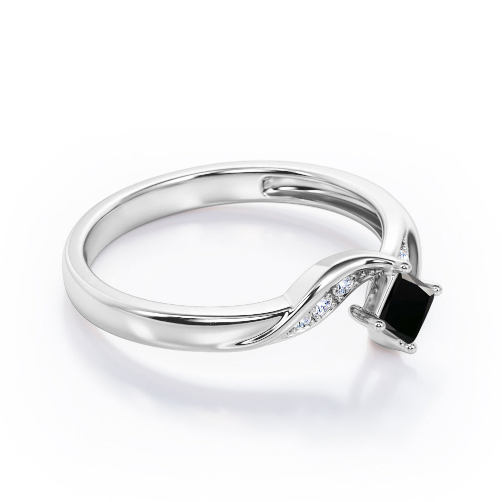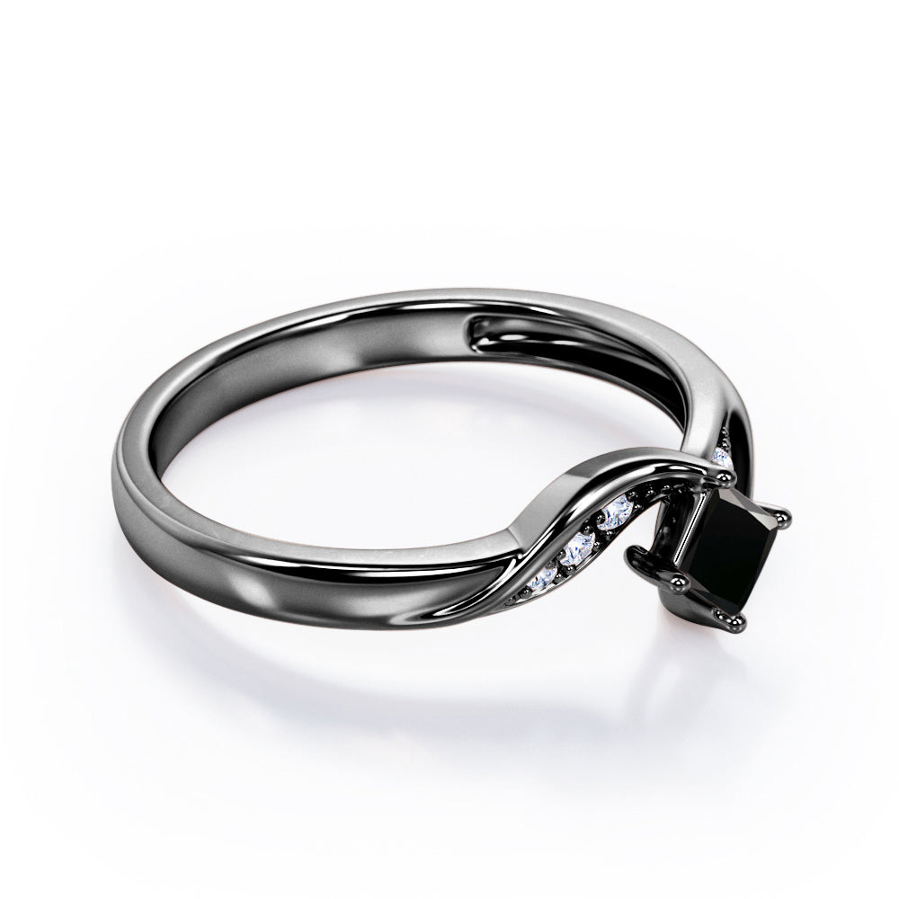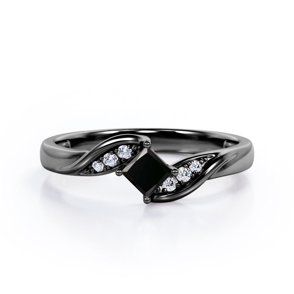 With 7 is believed to be a lucky number, this Twisted 7 Stone Ring - 0.55 carat Princess Black diamond Elegant Engagement Ring in Rose Gold can be another good option to be a meaningful gift to your lover. The promise ring possesses a 0.5 carat princess cut Black diamond along with three round Moissanite on each side of the band. Its shank is twisted and made parallel to each other, complementing the center stone very well. This classic Moissanite ring can be made in 18k gold over silver, 10k gold and 14k gold with the color of white gold, rose gold, yellow gold and black gold.