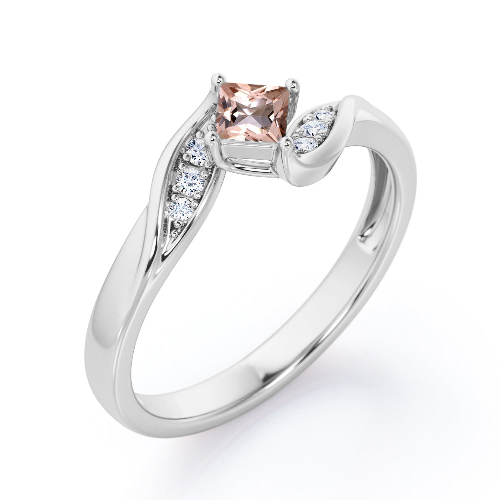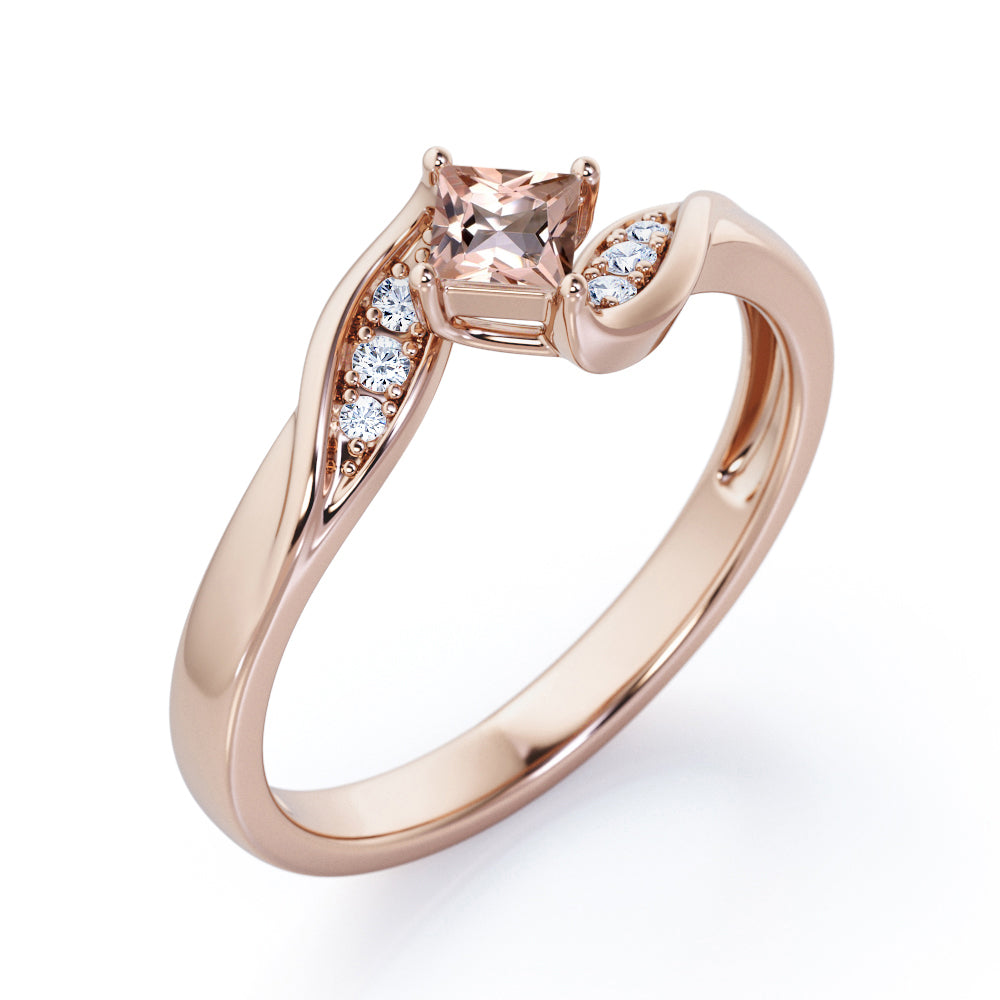 Twisted 7 Stone Ring - 0.55 carat Princess Morganite and Moissanite Elegant Engagement Ring in Rose Gold