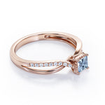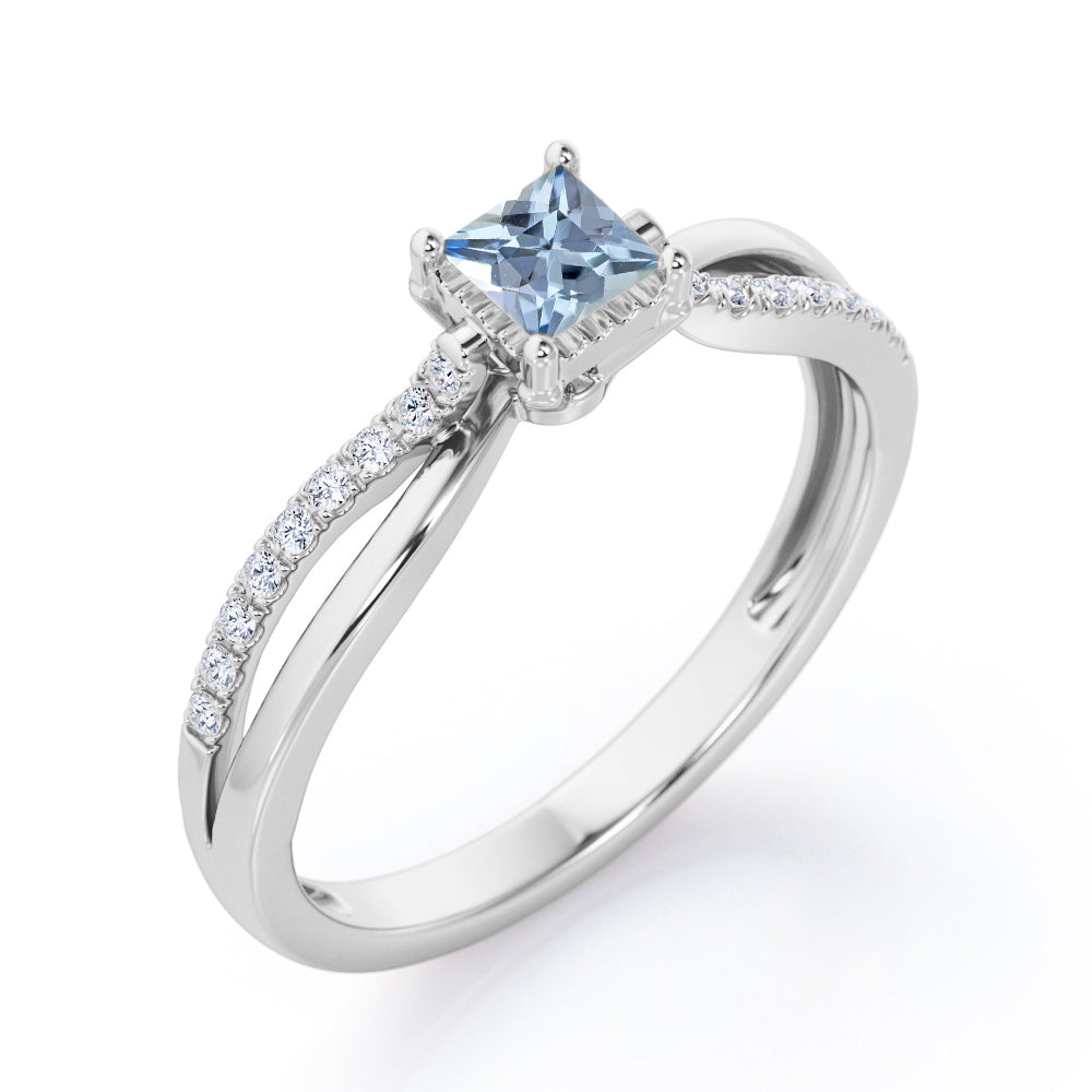 Twisted and Split Pinched Shank 0.65 carat Princess Aquamarine and Moissanites Elegant Engagement Ring in White Gold