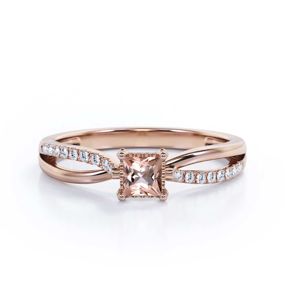 Twisted and Split Pinched Shank 0.65 carat Princess Morganite and Moissanites Elegant Engagement Ring in Rose Gold