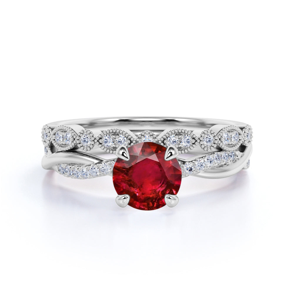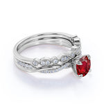 Infinity Twisted Band 1.50 Carat Round Cut Lab Ruby and Diamond Art Deco Wedding Ring Set in White Gold