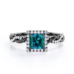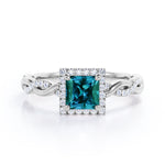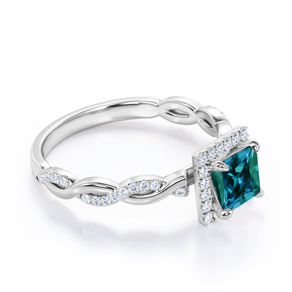 Twisted Four Claws 1.35 Carat Princess Cut Lab Created Alexandrite And Diamond Infinity Engagement Ring In White Gold For Her. Timeless and divine, this lab created alexandrite infinity ring is perfect for the minimalist bride who lean towards modern elegance. The center stone looks even more unique in a sharp princess cut, surrounded by a halo of white dazzling diamonds.The twisted bands are set with pave diamonds that perfectly frame a square cut alexandrite at the center. This infinity engagement ring features 1 carat lab grown alexandrite and 0.35 carat diamonds as the side stones. The four claws holds the center stone firmly at a place which exhibits great brilliance. This twisted 1.35 carat princess cut lab created alexandrite and diamond infinity engagement ring in white gold can also be customized to 18k Gold plating over silver, 10k Gold, 14k Gold or 18k Gold as per your preference.