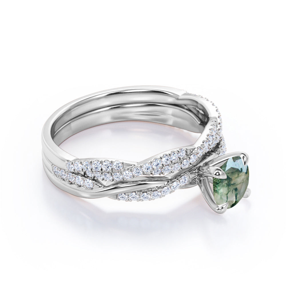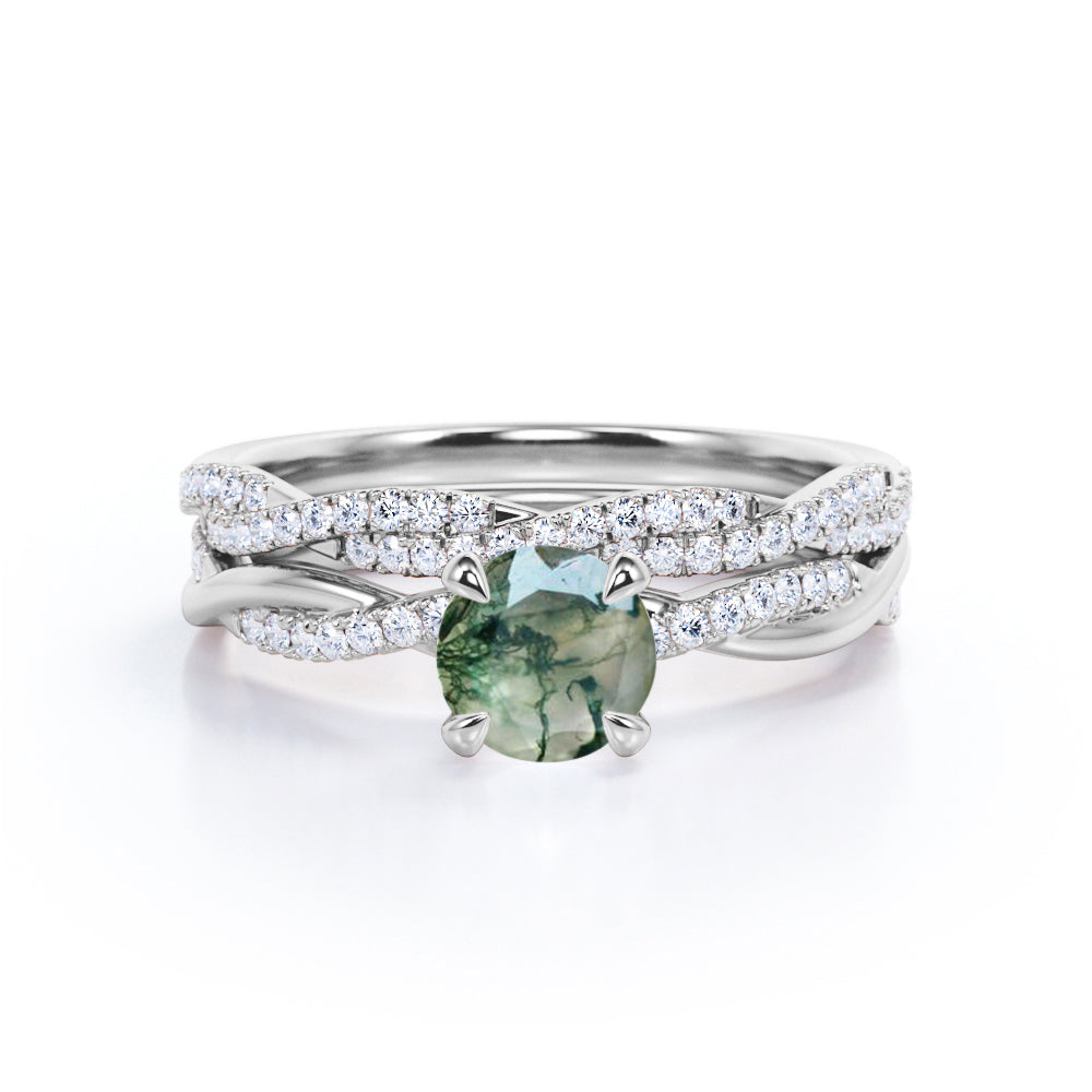 Twisted Shank 1.25 carat Round Moss Agate and Moissanite Bridal Ring Set in White Gold