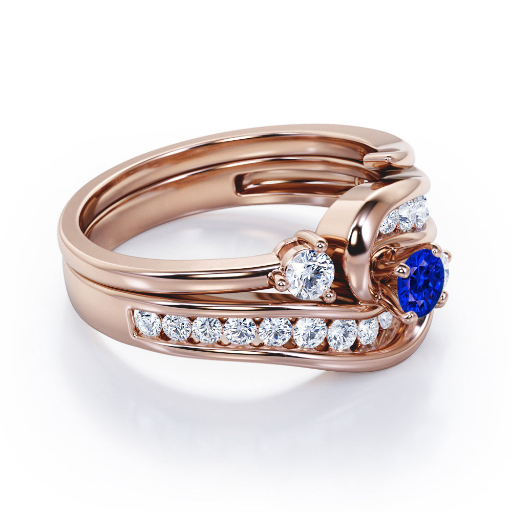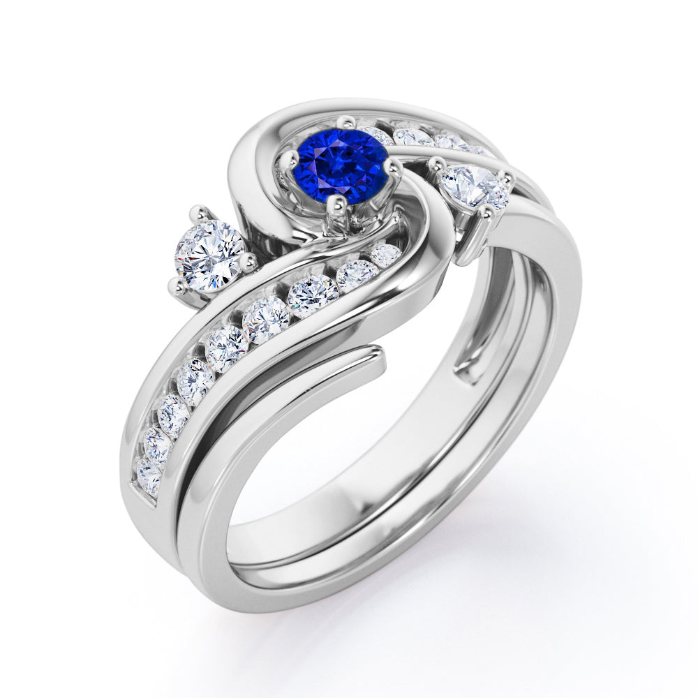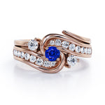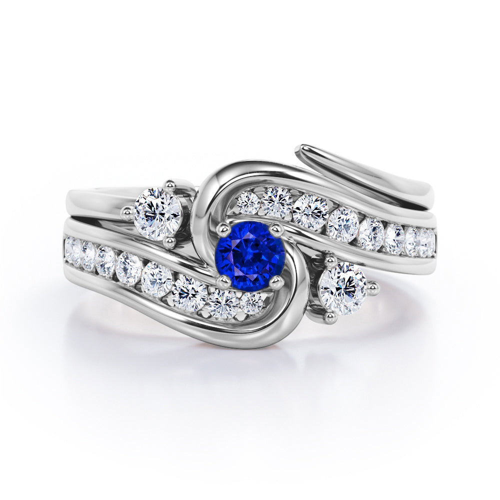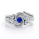 Twisted Tension - Prong 1 TCW Round Brilliant Cut Blue Sapphire and Moissanite - Flush Channel Wedding Set in White Gold