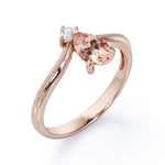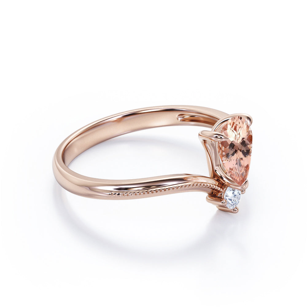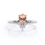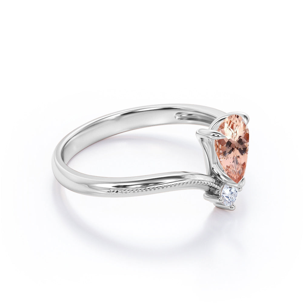 Promise your love with the Two Stones 0.55 carat Pear Morganite and Moissanite Nestled Engagement Ring in White Gold might be the right choice for you. The ring only features a 0.5 carat pear Morganite and a dainty round Moissanite underneath but the overall design can bewitch anyone who owns this elegant chevron engagement ring. Half of the band is also decorated by bead line, adding some vintage touch to the ring. Available at a very affordable price with the color of white gold, rose gold and black gold. Moreover, you can also choose either 18k gold over silver, 10k gold or 14k gold to be the metal of your ring.