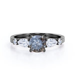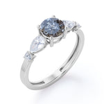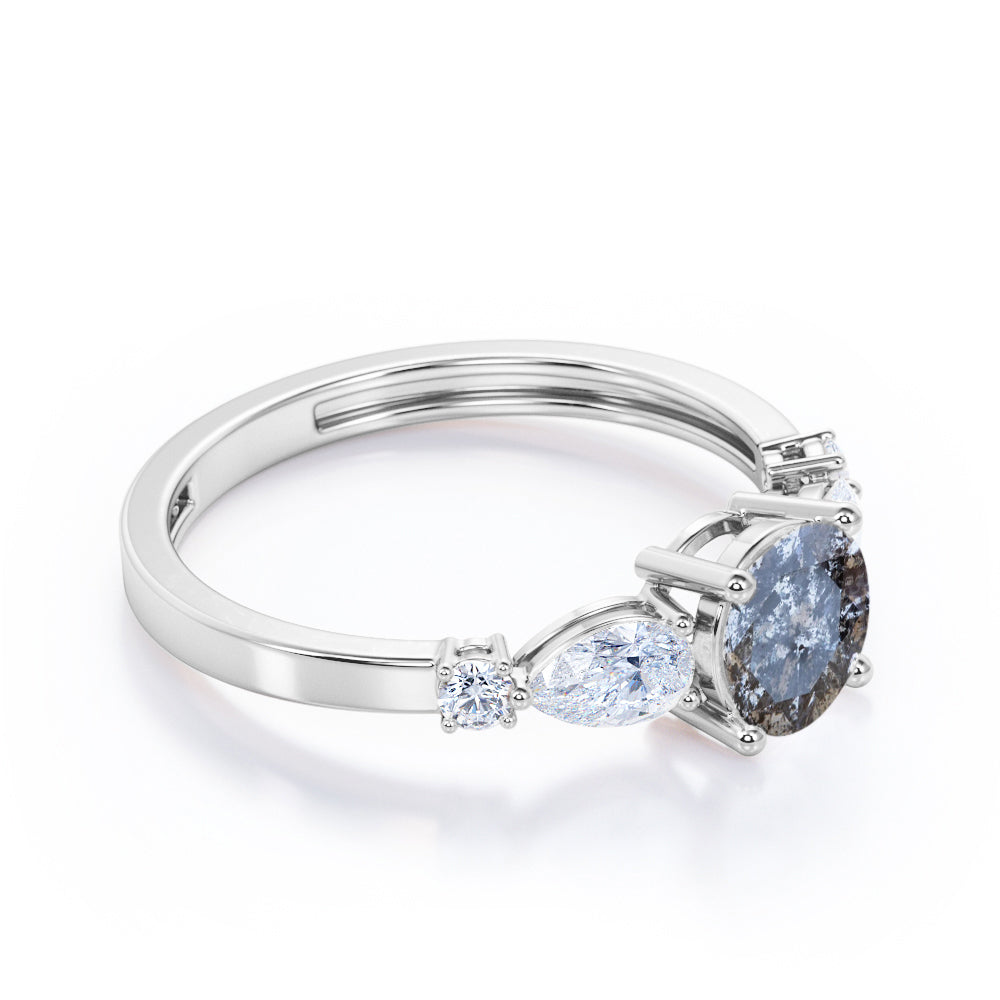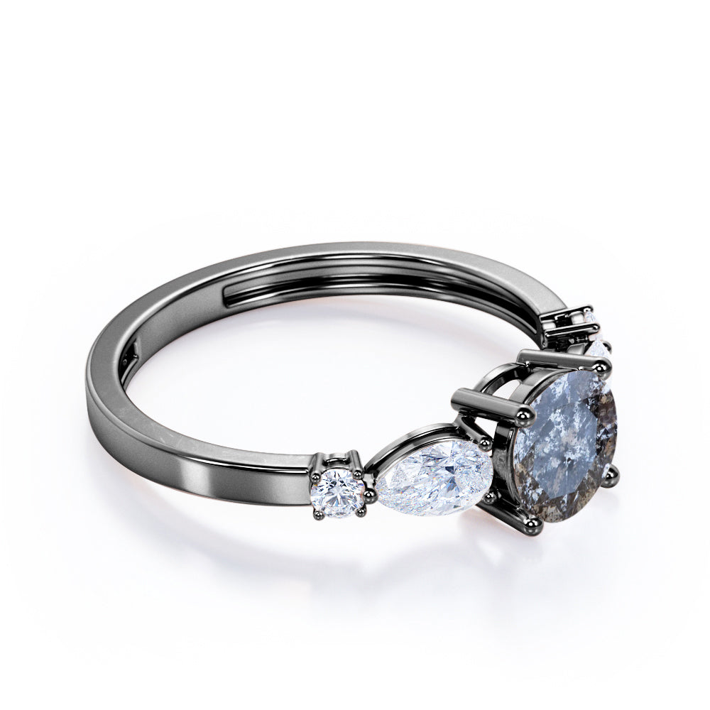 Unique 0.55 Carat Round Cut Natural Salt And Pepper Diamond Five Stone Engagement Ring In White Gold. Make your loved one speechless with this striking natural salt and pepper diamond engagement ring. The only answer she can give you is “YES!” when she sees the amazing detail of pear shaped side stones leading to the center stone that is a large statement piece. Adding to the beauty are more round cut sparkling white diamonds that accentuate the shank. This round cut engagement ring features 0.33 carat translucent and natural icy grey salt and pepper diamond at the center followed by 0.22 carat of white diamonds which radiates immense sparkle. Nothing is more beautiful than a ring that sparkles and shines from all angles and this five stone ring offers you class and glamour effortlessly. This unique 0.55 carat round cut natural salt and pepper diamond five stone engagement ring in white gold can also be made in 18k Gold plating over silver, 10k Gold or 14k Gold as per your preference. Customize this alluring engagement ring and make it truly come from your heart with Shygems, who specializes in handmade rings and matching your love one with the perfect ring!