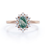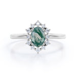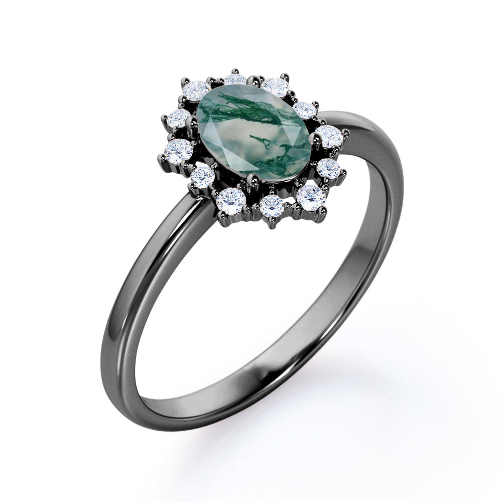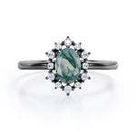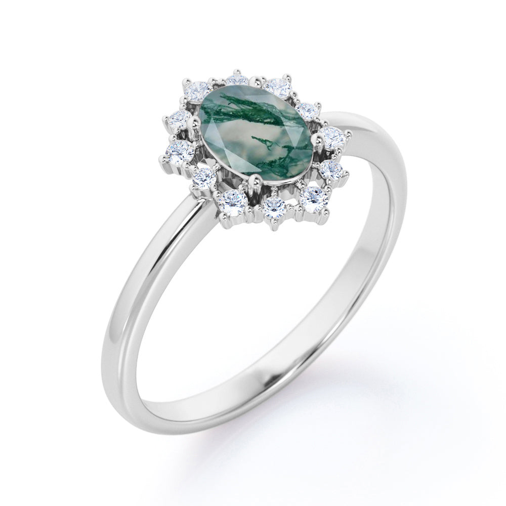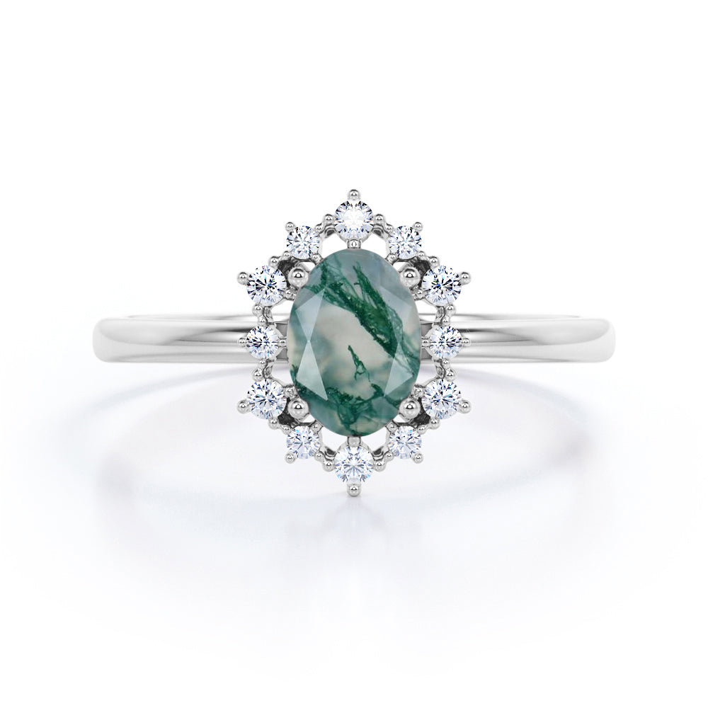 Unique 0.6 carat Oval Moss Agate and Moissanite Floating Halo Engagement Ring in White Gold presents 0.5 carat oval cut of dendritic tree Moss agate in the center and framed by a floating halo. Unlike any other halo that all the gemstones are connected and looks full, it is crafted in a special design where each round dainty Moissanite will look distance from each other but also connected. The prongs not only hold gemstones in place but it also act as a bead decoration that makes this Moss agate ring looks magnificent. The promise ring comes in 18k gold over silver, 10k gold and 14k gold and you can also choose the color either white gold, rose gold, yellow gold and black gold.