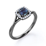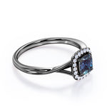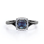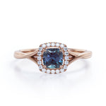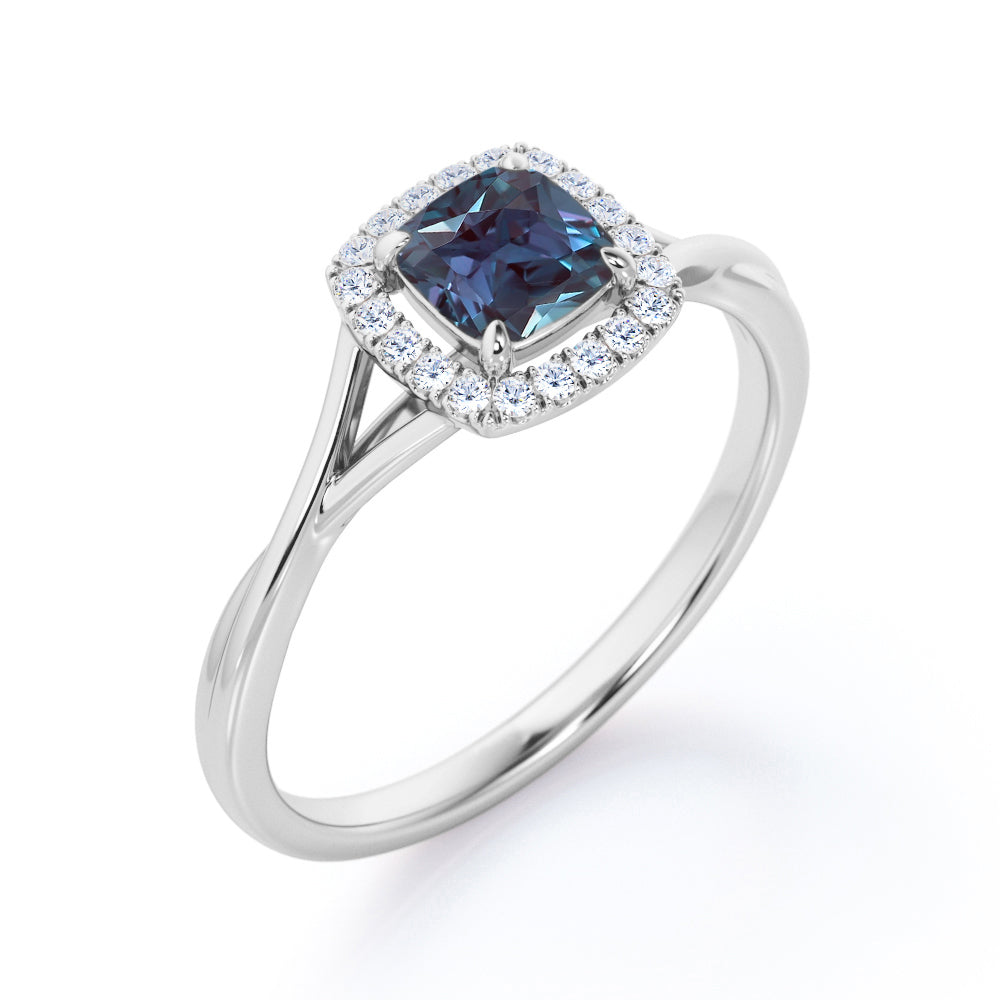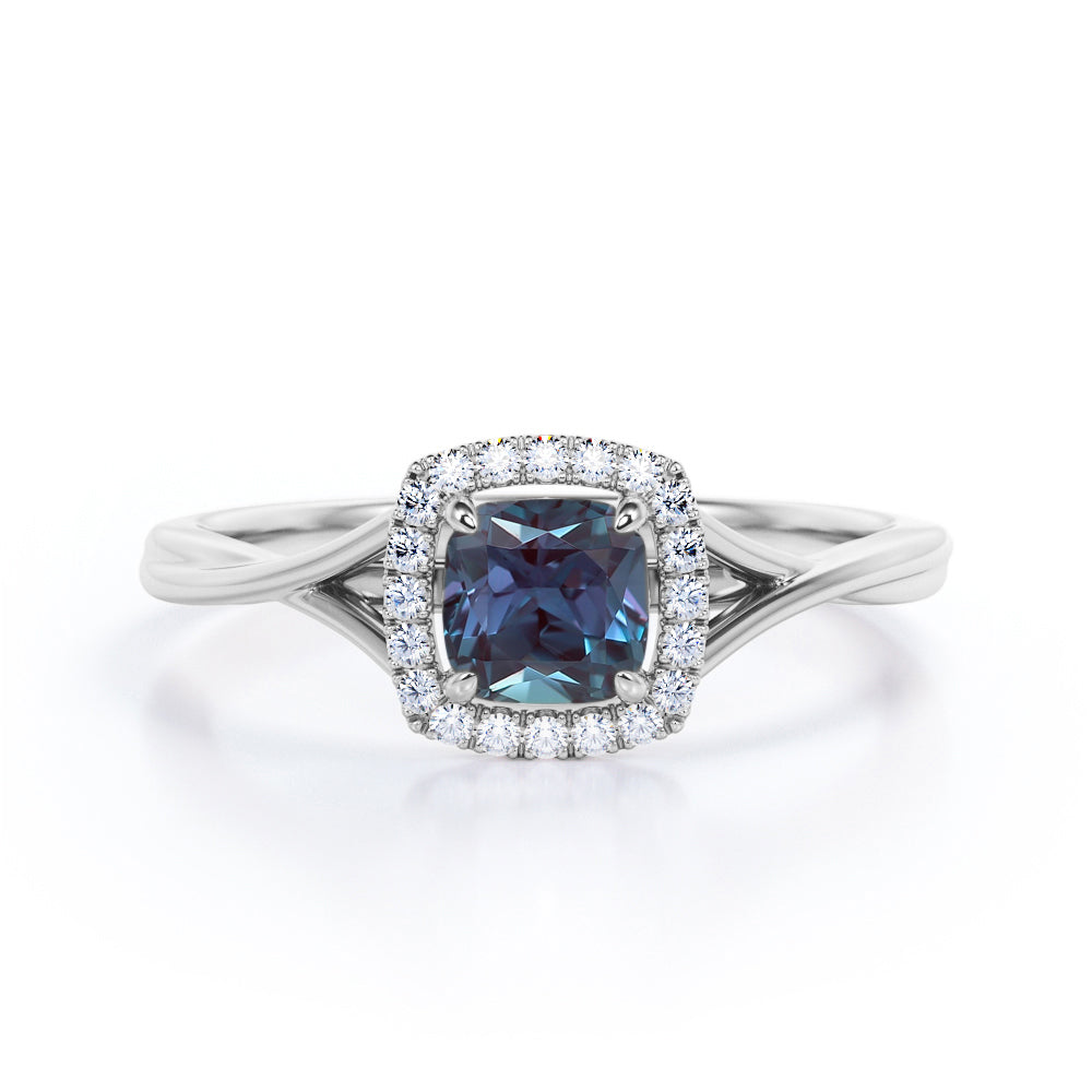 Unique 1.25 Carat Cushion Cut Lab Created Alexandrite And Diamond Split Shank Engagement Ring In White Gold. If you’re looking for a more unique and unusual engagement ring, this lab created alexandrite engagement ring would be a great option to go for. This cushion cut simple but stunning engagement ring features a plain split shank white gold band to put all the focus on the center stone. The pave set diamonds in the halo setting adds that extra glimmer to this elegant lab grown alexandrite engagement ring. The four claws holds the center stone of 1 carat lab grown alexandrite and is surrounded by 0.25 carat of sizzling white diamonds. This total 1.25 carat cushion cut lab created alexandrite and diamond split shank engagement ring in white gold can also be customized to 18k Gold plating over silver, 10k Gold, 14k Gold or 18k Gold as per your desire.