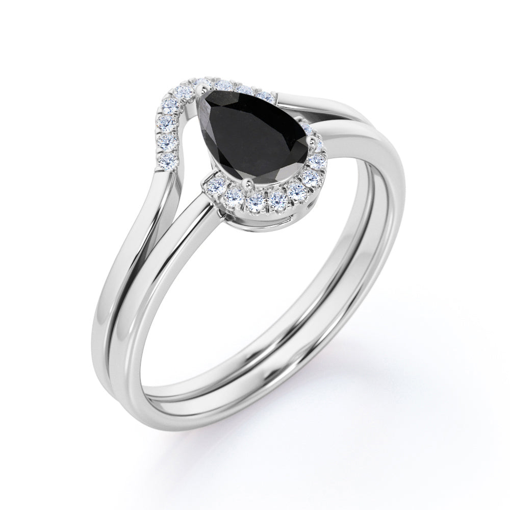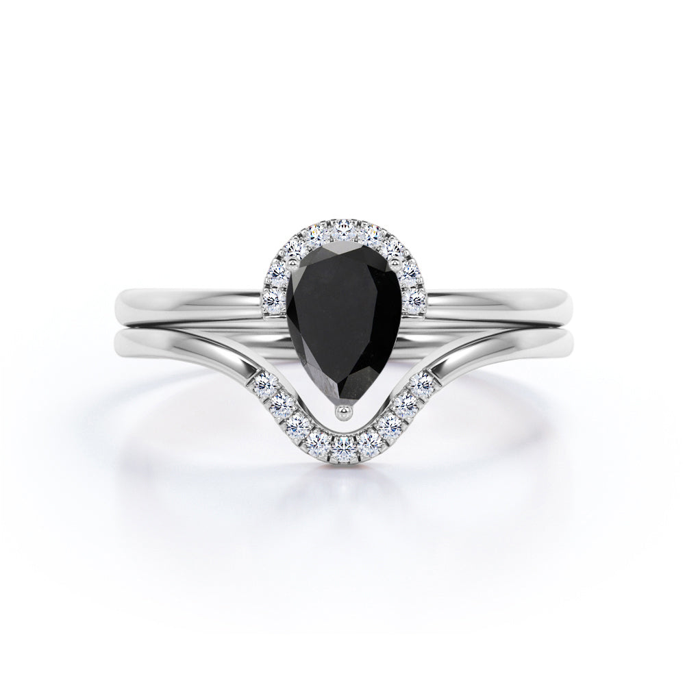 Unique 1.25 Carat Teardrop Shape Lab Black Diamond Bridal Set with contour band in White Gold. Affordable yet designer vintage design sparkling black Diamond bridal ring set, perfect for her, highlights total 1.25 carats perfect lab created black diamond and glittering diamonds and is made in solid 10k White Gold. Handmade by our skilled artisan jeweler, this piece is truly one of a kind. And as always, the order comes with our 30 DAYS FULL REFUND policy, GUARANTEED DELIVERY within 5 Days, and in a BEAUTIFUL Jewelry Ring Box.