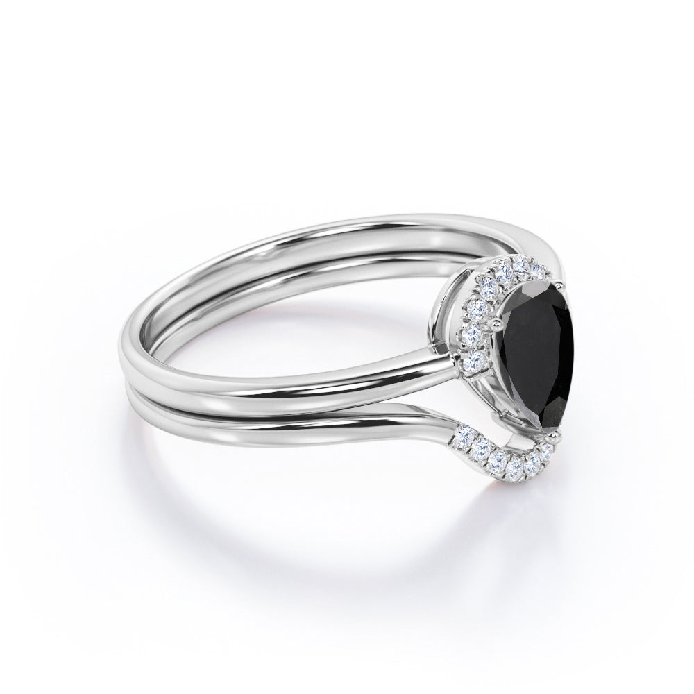 Unique 1.25 Carat Teardrop Shape Lab Black Diamond Bridal Set with contour band in White Gold