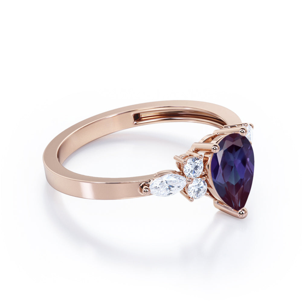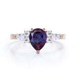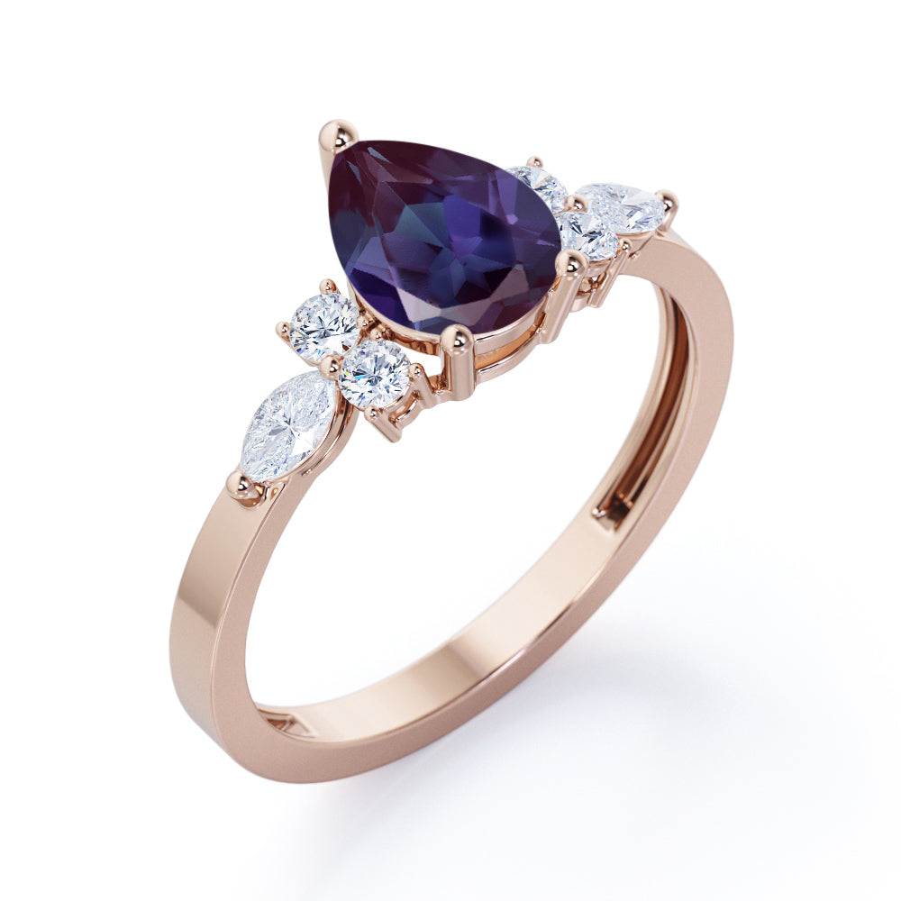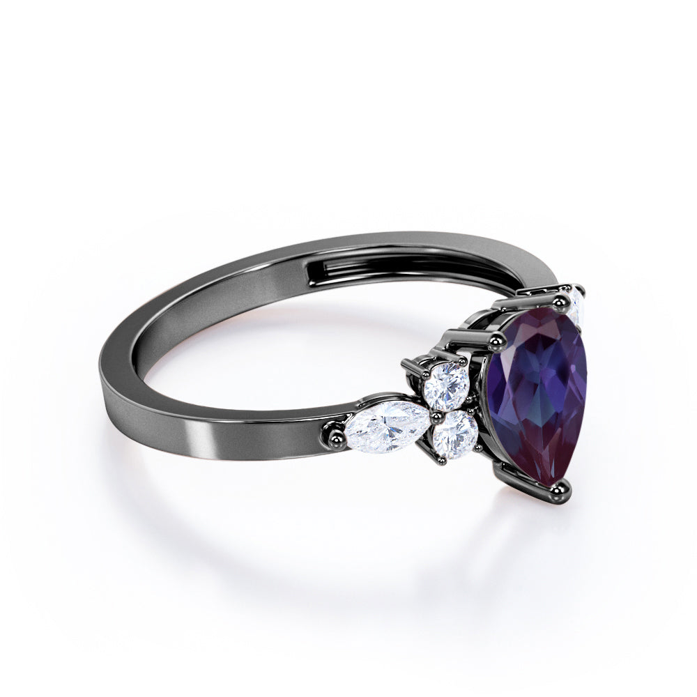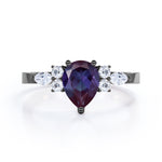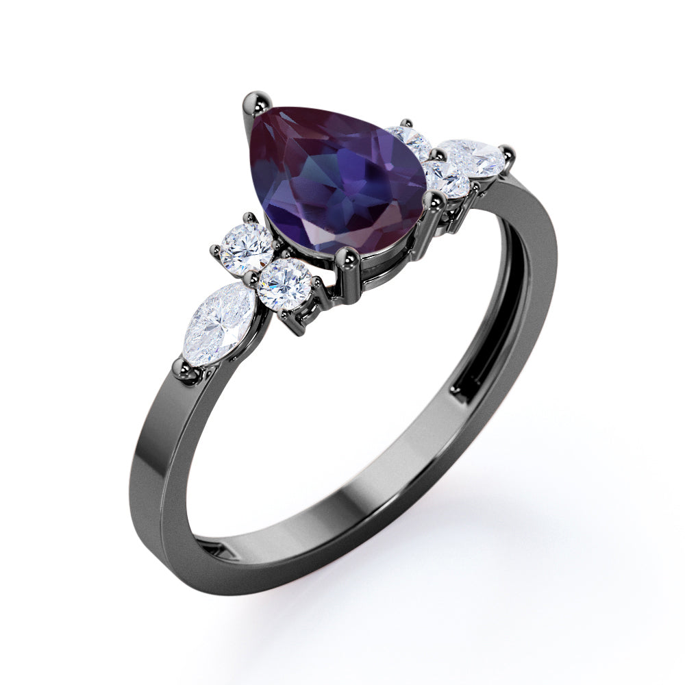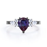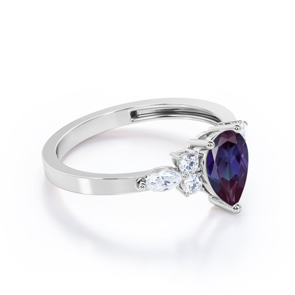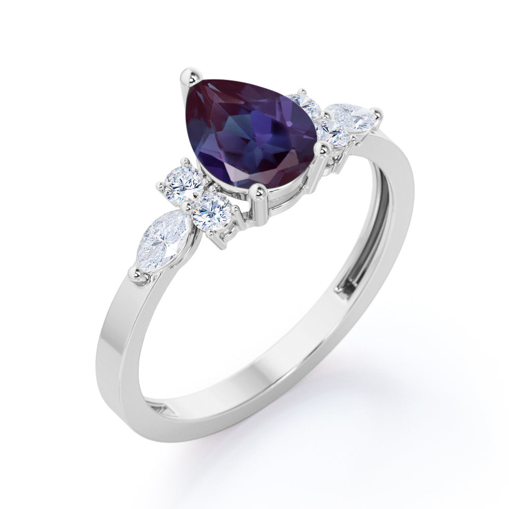 Unique 1.35 Carat Tear Drop Lab Created Alexandrite And Diamond Seven Stone Engagement Ring In White Gold. Simply spectacular, the Seven Stone lab grown alexandrite and diamond engagement ring is truly breathtaking. A beautifully vibrant lilac purple 1 carat pear cut alexandrite takes center stage in this three pronged ring. This tear drop shaped ring features two marquise shape and two round cut sizzling white diamonds of 0.35 carat on either side which illuminates great brilliance. A versatile ring design that can make its own statement, or add to any look this seven stone ring will do all the justice to your overall look. Handmade with utmost love and attention to detail by our devoted artisans, this lab grown alexandrite and diamond engagement ring is certainly an exceptional choice that definitely will stand out. This unique 1.35 carat tear drop lab created alexandrite and diamond seven stone engagement ring in white gold can also be customized to 18k Gold plating over silver, 10k Gold or 14k Gold as per your preference.