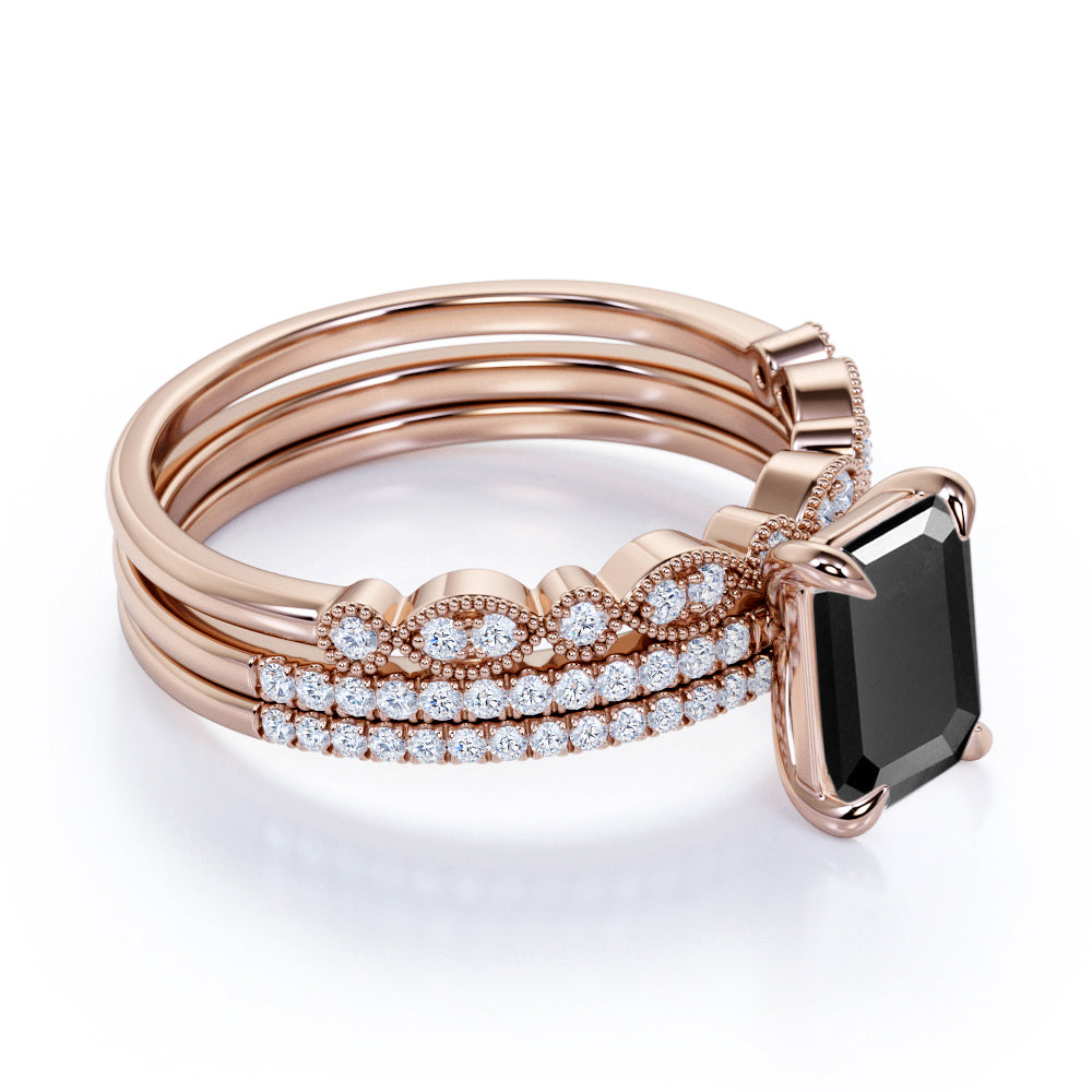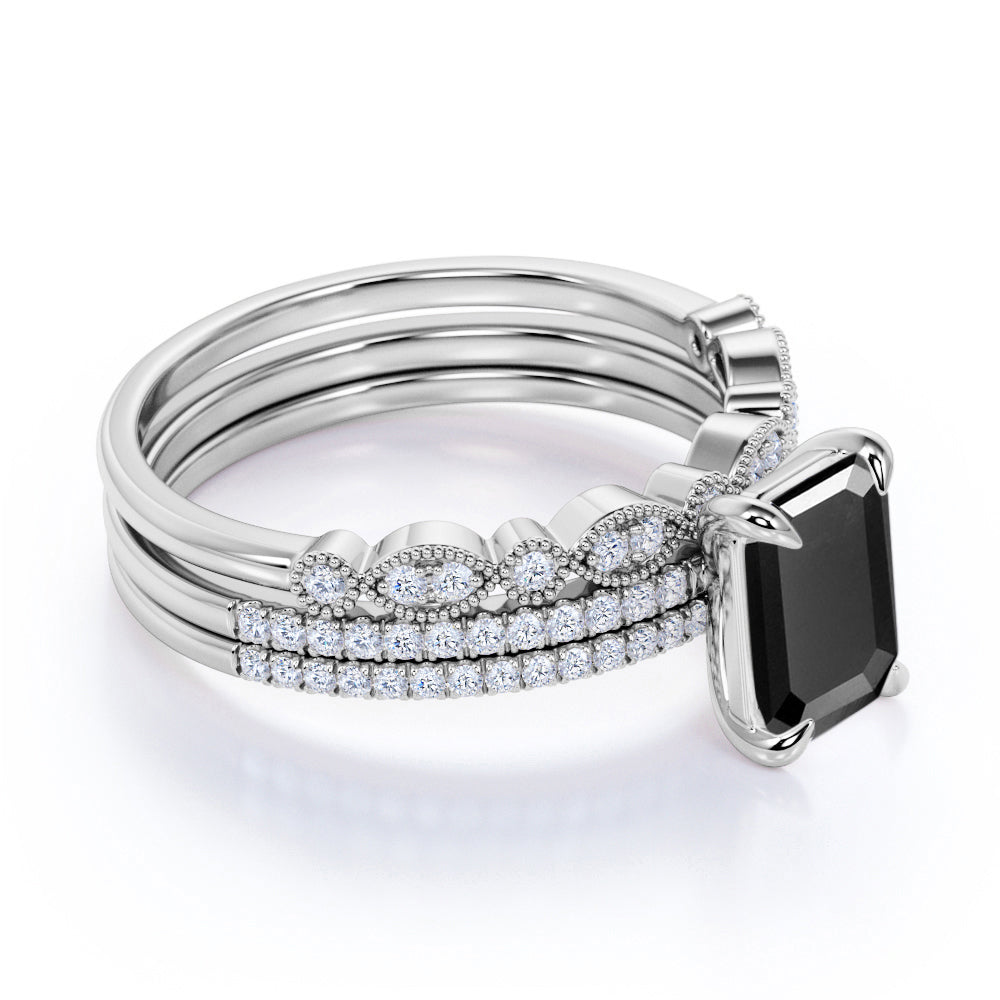 Unique 1.75 Carat Emerald cut Lab Black Diamond Trio Wedding Ring Set in White Gold for Her