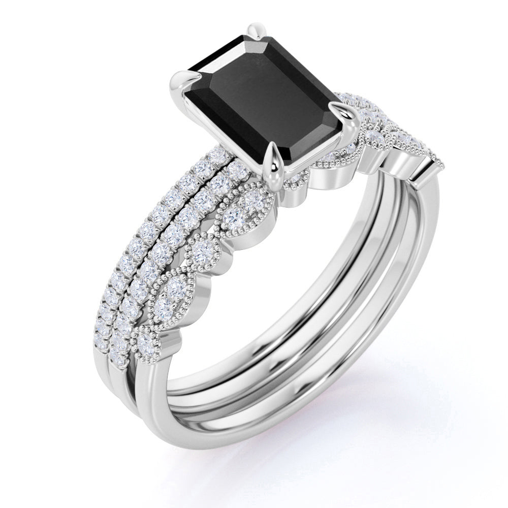 Unique 1.75 Carat Emerald cut Lab Black Diamond Trio Wedding Ring Set in White Gold for Her. Fascinating antique black Diamond wedding ring set with engagement ring and wedding bands features total 1.75 carats perfect lab created black diamond and glittering diamonds and is made in solid 10k White Gold. The beautiful wedding ring band is handmade and personalized by me or one of my other skilled jewelry associates with over 15 years of experience. And as always, the order comes with our 30 DAYS FULL REFUND policy and in a BEAUTIFUL Jewelry Ring Box.