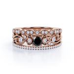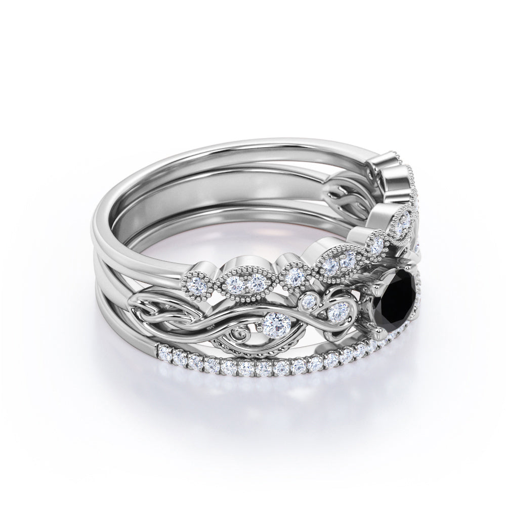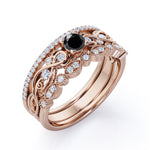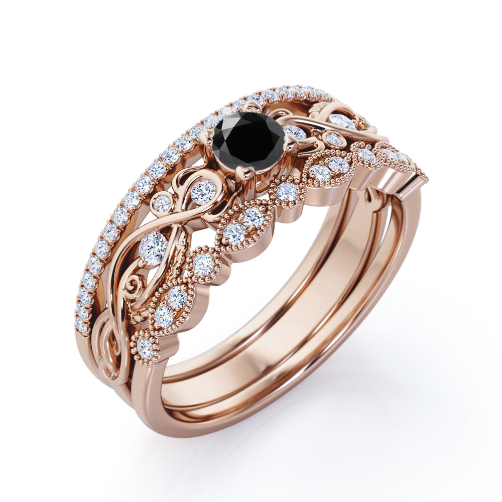 Unique 1.50 Carat Round cut Black Diamond Trio Wedding Ring Set in Rose Gold for Her. Affordable yet designer antique black Diamond wedding ring set with engagement ring and wedding bands features total 1.5 carats perfect lab created black diamond and glittering diamonds and is made in solid 10k Rose Gold. The piece is handmade, for a refreshingly beautiful and unique look, away from the ordinary. And as always, the order comes with our 30 DAYS FULL REFUND policy, GUARANTEED DELIVERY within 5 Days, and in a BEAUTIFUL Jewelry Ring Box.