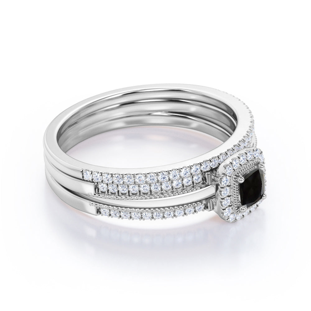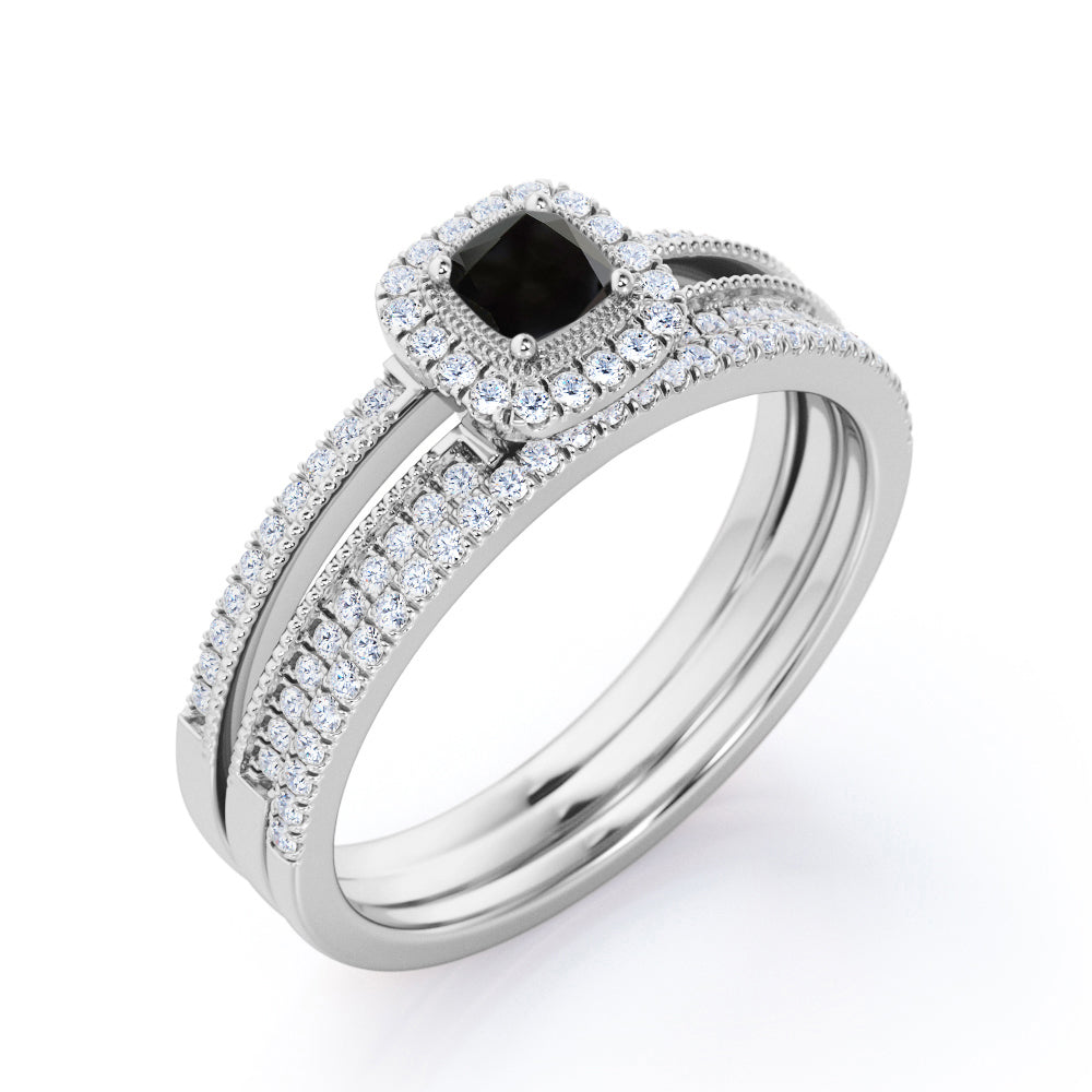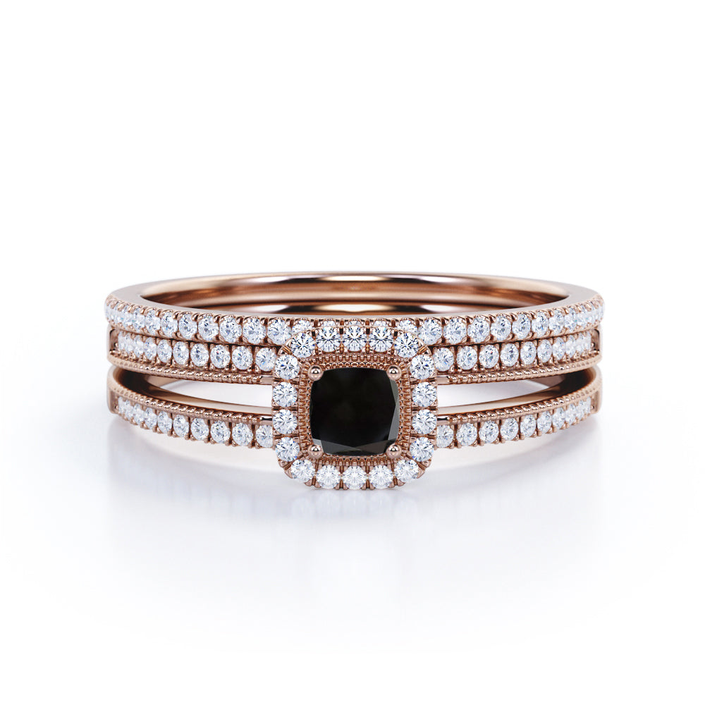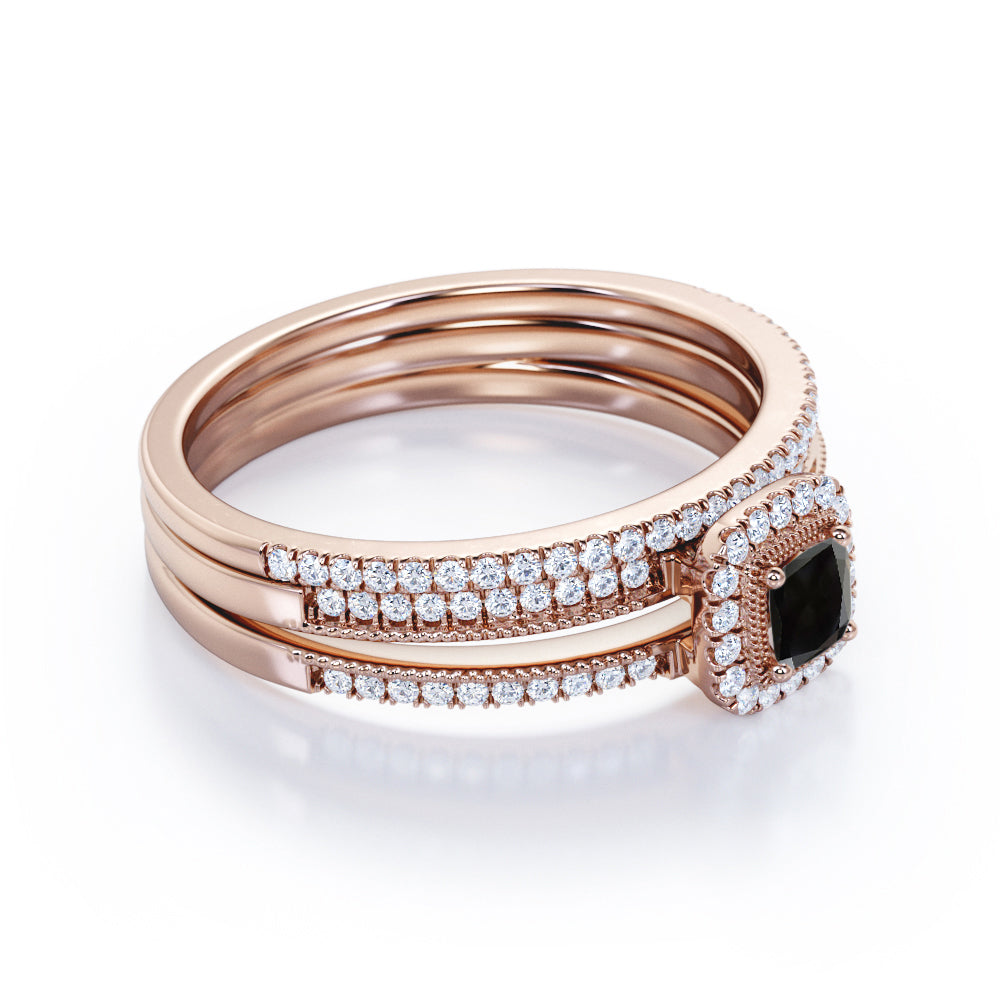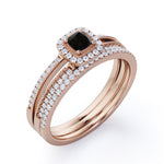 Unique 1.50 Carat Lab Black Diamond Halo Wedding Ring Set for Her in Rose Gold