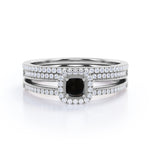 Unique 1.50 Carat Black Diamond Halo Wedding Ring Set for Her in Rose Gold. Wonderful black Diamond affordable wedding ring set with engagement ring and wedding bands showcases total 1.50 carats perfect lab created black diamond and glittering diamonds and is made in solid 10k Rose Gold. Get cool bohemian style with a piece of one of a kind handmade jewelry. And as always, the order comes with our 30 DAYS FULL REFUND policy, GUARANTEED DELIVERY within 5 Days, and in a BEAUTIFUL Jewelry Ring Box.