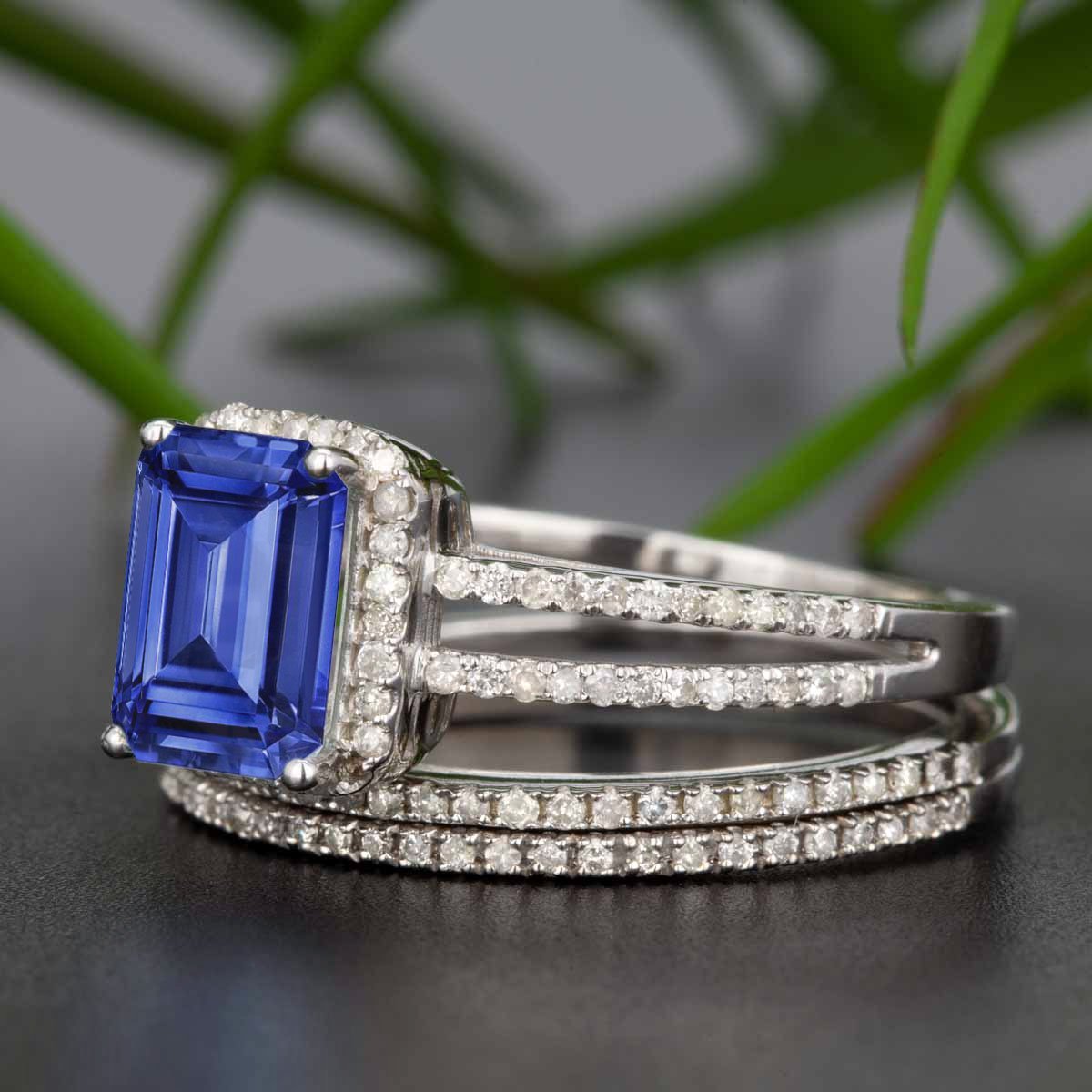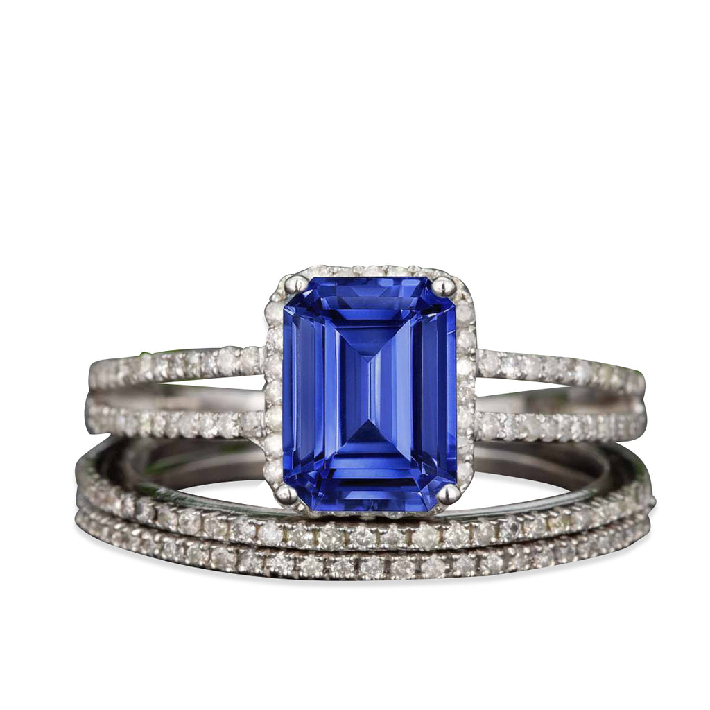 Unique 2 Carat Emerald Cut Natural Sapphire and Moissanite Wedding Trio Ring Set with Engagement Ring and 2 Wedding Bands in 18k Gold Over Silver
