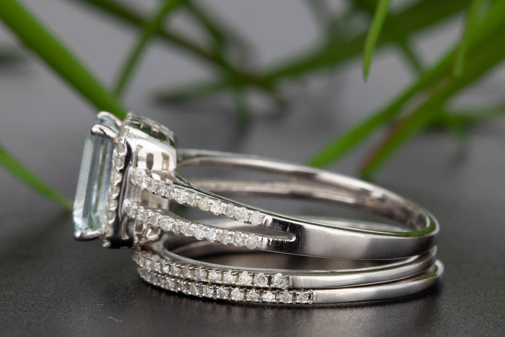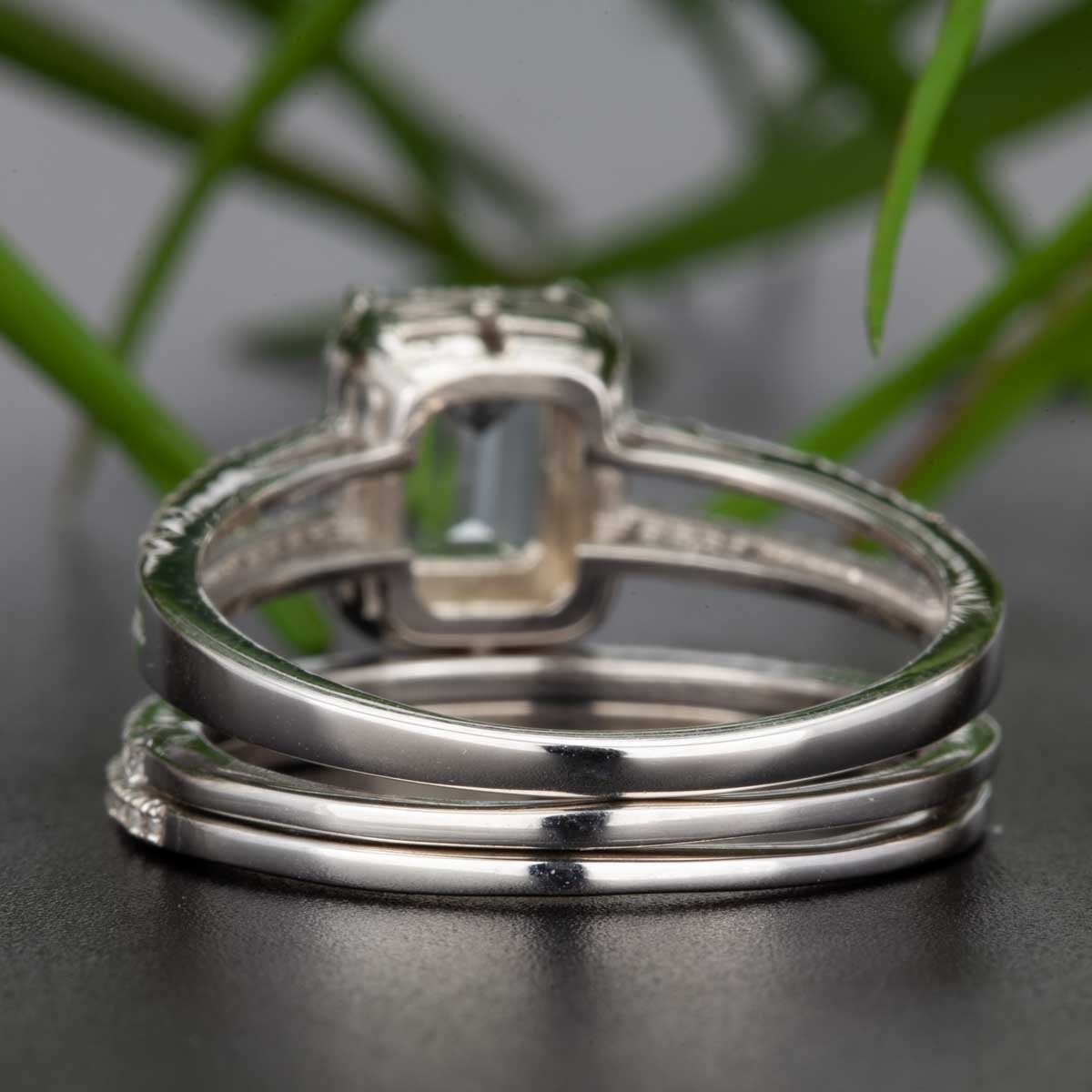 Unique 2 Carat Emerald Cut Real Sapphire and Moissanite Wedding Trio Ring Set with Engagement Ring and 2 Wedding Bands in 18k Gold Over Silver. The bridal wedding ring is made with natural Sapphire and high quality Moissanites that can be a perfect alternative to diamond rings as moissanites have almost the same durability and quality as with diamonds that will last for a lifetime. The halo Sapphire trio bridal set is made on real 18k Gold over Silver. The very Unique trio wedding set comes with the main Sapphire engagement ring paired with the 2 pieces Moissanite wedding ring bands to make the perfect trio blue Sapphire and Moissanite trio wedding ring set. Your beautiful jewelry ring comes with a 30 days full refund policy. The beautiful antique Sapphire and Moissanite wedding ring set for women will make the perfect gift for her, whether you are looking for engagement, valentine's day, mothers day or anniversary gift.