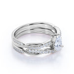 Unique 1.25 Carat Pear cut Moissanite and Diamond Infinity Pave Wedding Ring Set for Her in White Gold. Affordable yet designer antique white Moissanite wedding ring set with engagement ring and wedding bands highlights 0.75 carat perfect real white Moissanite and 0.50 carat glittering diamonds and is made in solid 10k White Gold. Break away from the generic look of mass-produced jewelry with this intricate handmade piece.