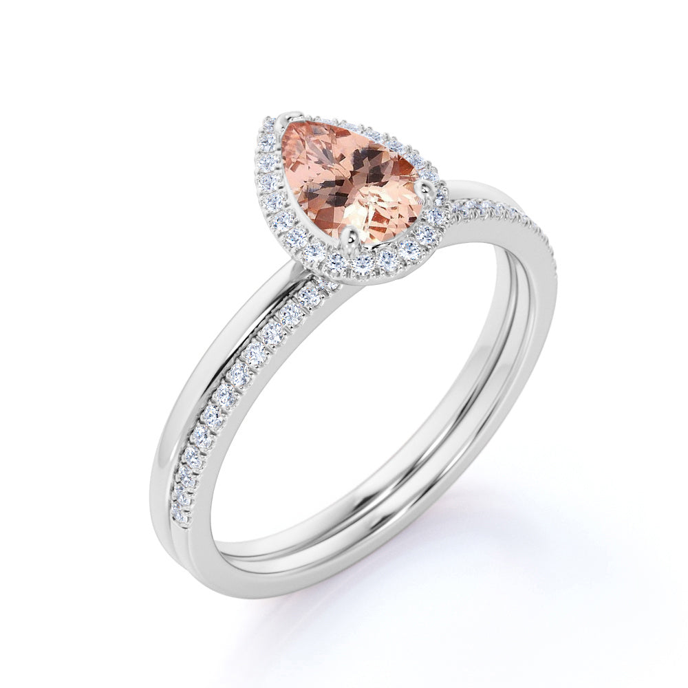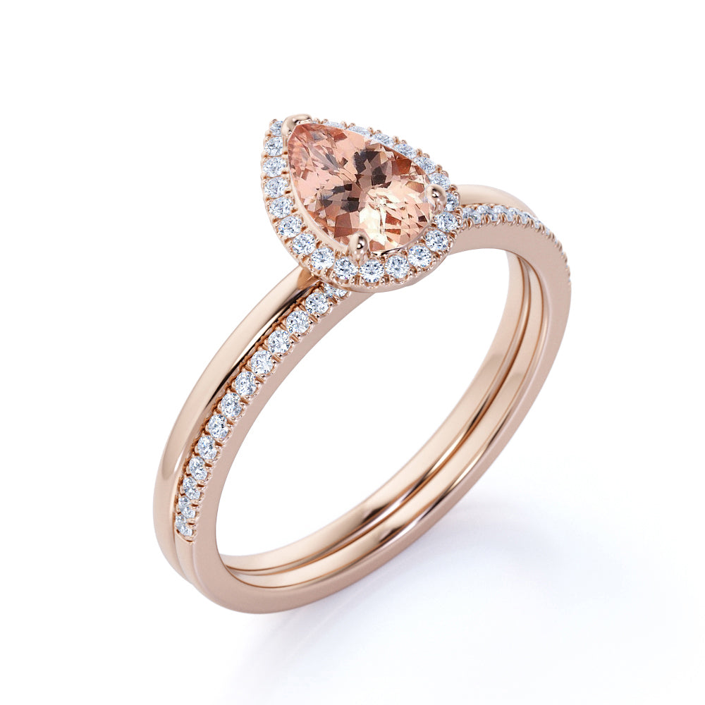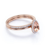 Unique 1.50 Carat Pear cut Morganite and Diamond Halo Wedding Ring Set for Her in Rose Gold