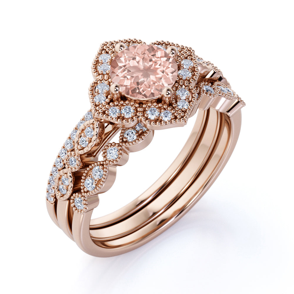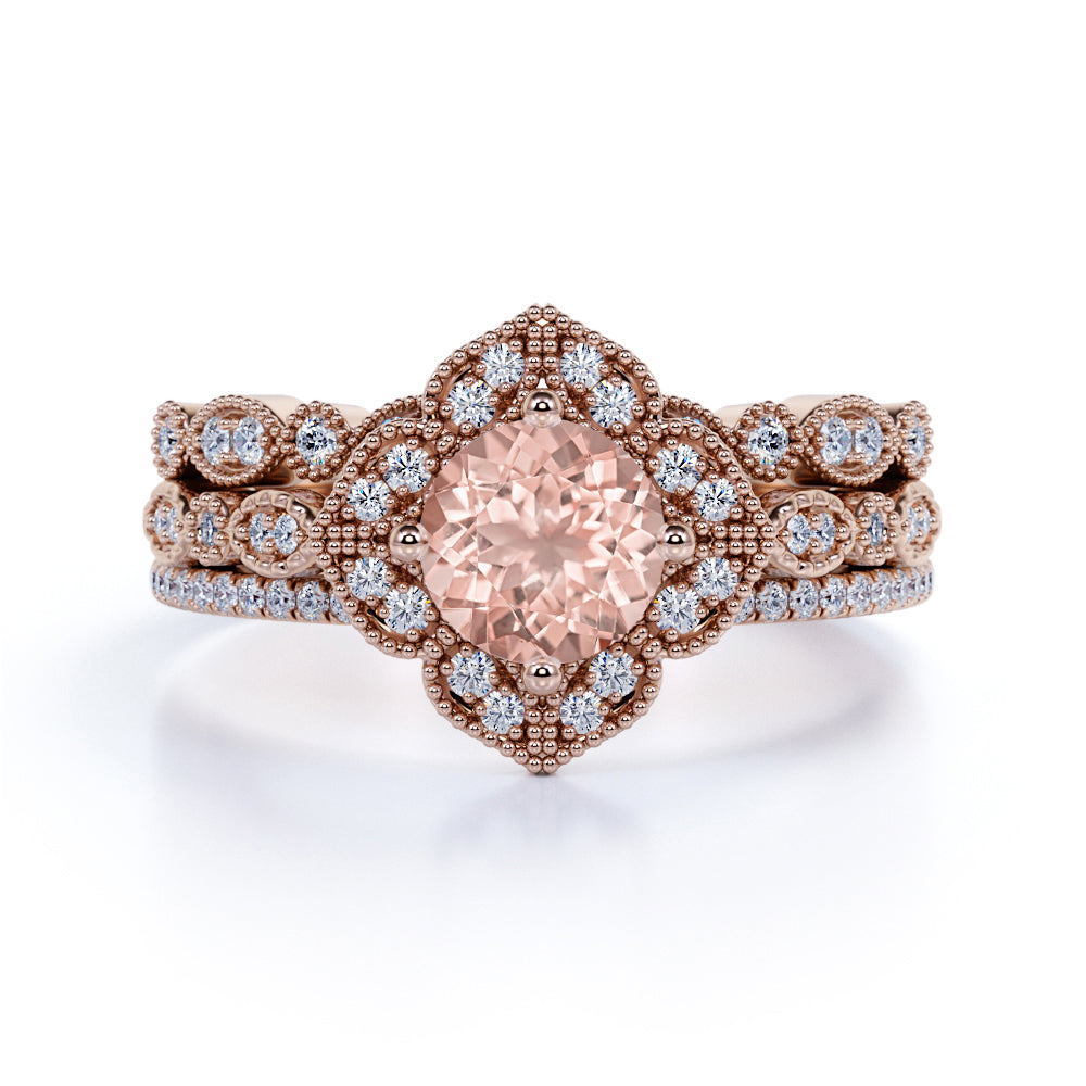 Unique 2 Carat Round Cut Peach Morganite and Diamond Trio Bridal Ring Set in 10k Rose Gold On Sale