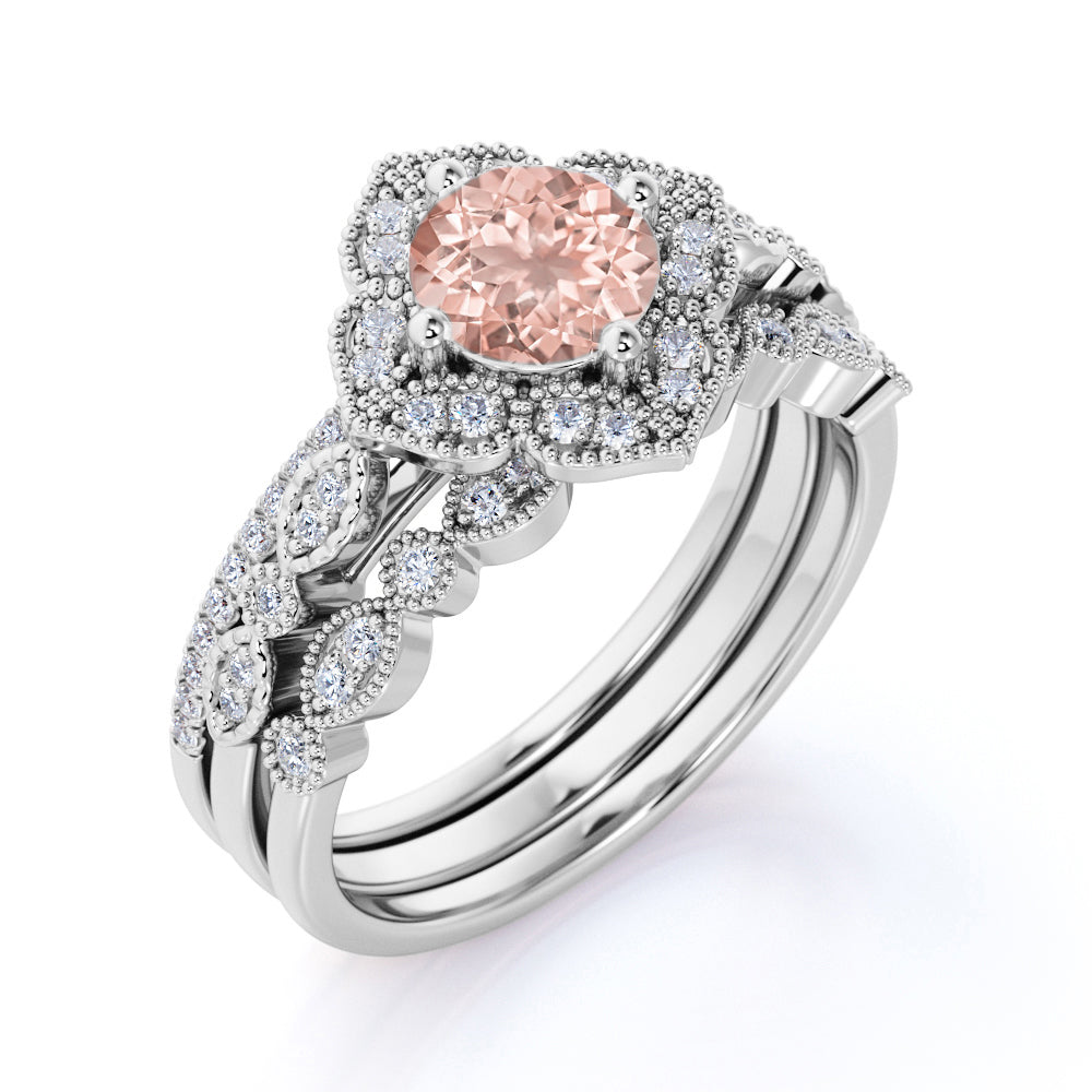 This is a very beautiful handmade art deco style Morganite and Diamond Trio Wedding Ring Set for women featuring the main engagement ring along with 2 matching wedding ring bands. The trio bridal wedding ring set is made with real peach pink morganite, real diamonds and on real gold. The handcrafted engagement ring features peach pink 1 carat round cut morganite in the center, and the engagement ring and 2 matching wedding ring bands have 1 carat of diamonds together, for a total carat weight of 2 Carats.