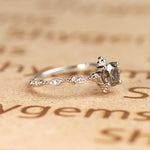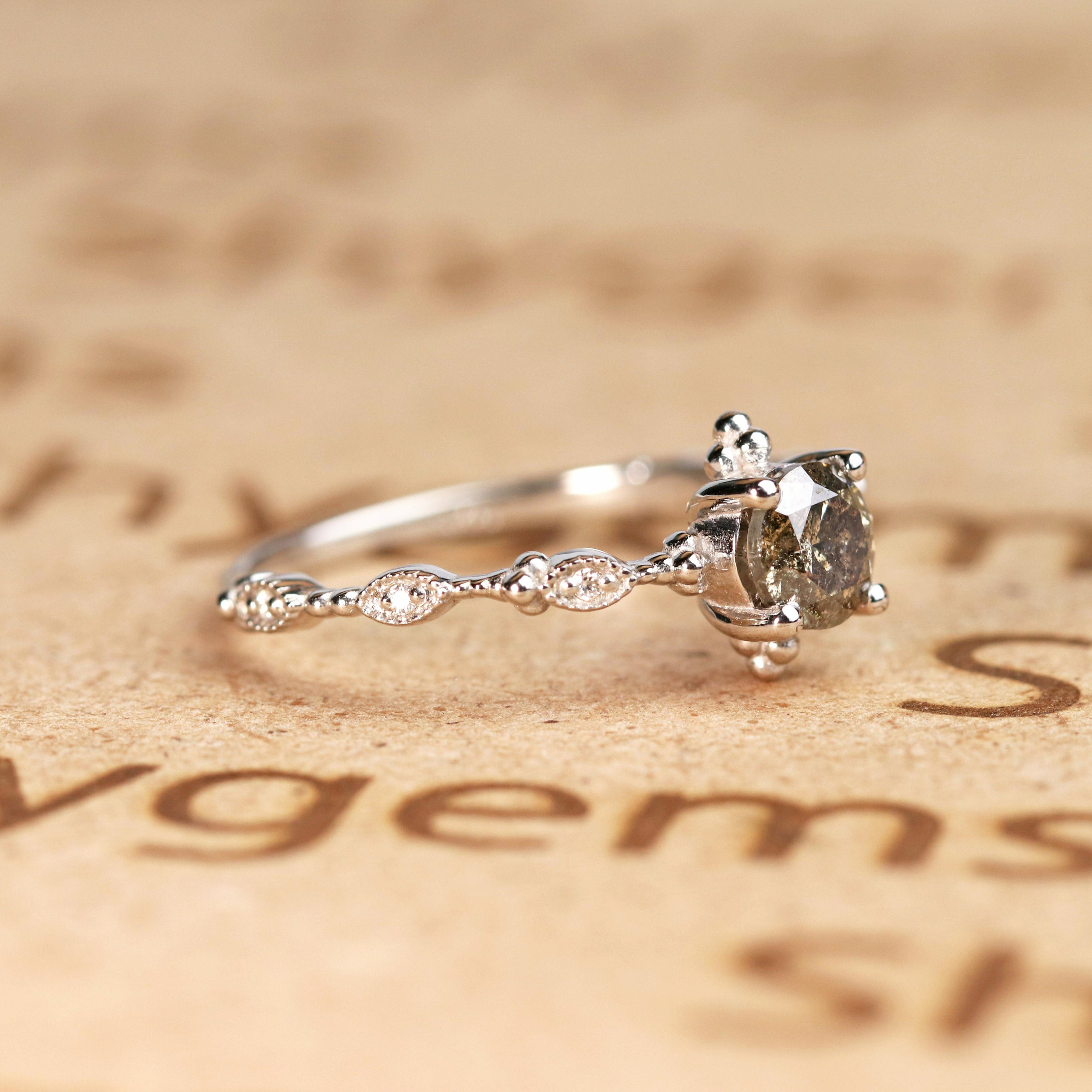 IMPORTANT NOTE: SINCE WE USE NATURAL SALT & PEPPER DIAMOND, EACH STONE WILL BE UNIQUE AND DIFFERENT IN TERMS OF COLORS AND INCLUSIONS. PLEASE BE INFORMED THAT THE CENTER STONE MAY NOT LOOK EXACTLY THE SAME AS IN THE ADVERTISED PICTURES. Be sure to please her with this Unique .65 Carat Round Cut Natural Salt and Pepper Diamond Dainty Modern Engagement Ring in 18k White Gold over Silver. This engagement ring features a .50 carat round cut natural salt and pepper diamond in the center and .15 carat round cut moissanite side stones. This dainty engagement ring is accent with cluster of beads and milgrain lining which make the design unconventionally unique. Moreover, the ring can be customized to 18k White Gold, Rose Gold or Yellow Gold plating over silver as per your selection. Also, as your satisfaction is our most priority, we will do our best to have your handmade jewelry be carefully and beautifully crafted by our expert jewelers. The order also comes with an elegant jewelry ring box and with 30 days full refund policy. Unlike other gemstones, not a single salt and pepper diamond will look the same with another. This adds to why it's a very popular gemstone. Less expensive than traditional white diamonds and most definitely more unique. This one of a kind gemstone will surely add a sentimental value to your gift. Wrap this up as a gift and be sure to impress. Whether it's a proposal, a wedding, an anniversary, a birthday, a Valentine's day or for holiday gifting - this is a suitable gift for any occasion.