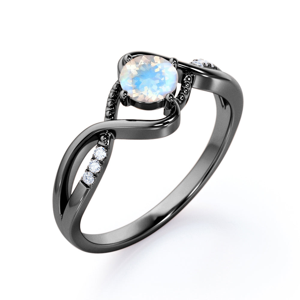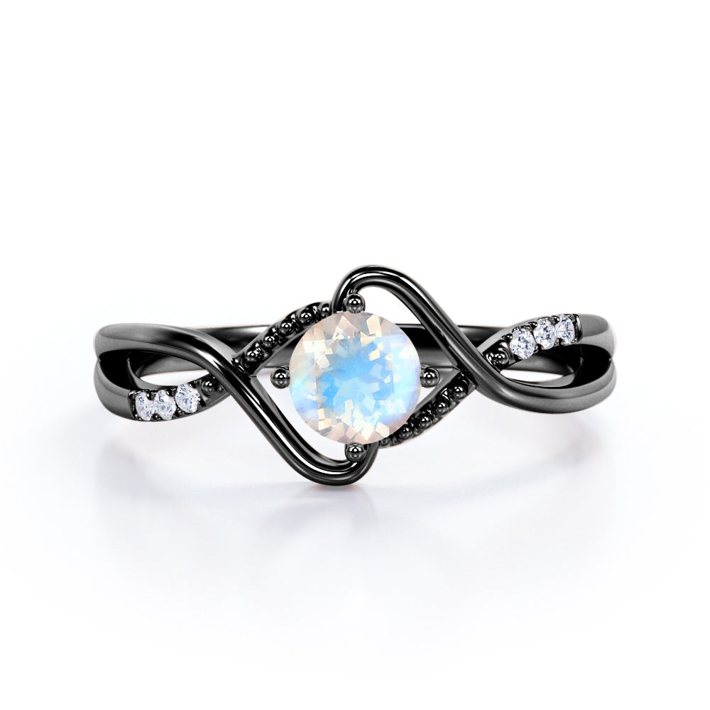 Notch your look with the Unique Artistic 0.55 carat Round Moonstone and Moissanite Twisted Shank Engagement Ring in Black Gold. A 0.5 carat Round Moonstone is held in prong setting where the twisted shank embraces it and illustrates the shape of hearts. Paved round Moissanite is presented on a part of the band where it also connects with Milgrain line. The band is not only braided but it also presents the infinity sign. Show your forever love to her with this affordable promise ring. It can be made in 18k gold over silver, 10k gold and 14k gold with the color of white gold, rose gold, yellow gold and black gold.
