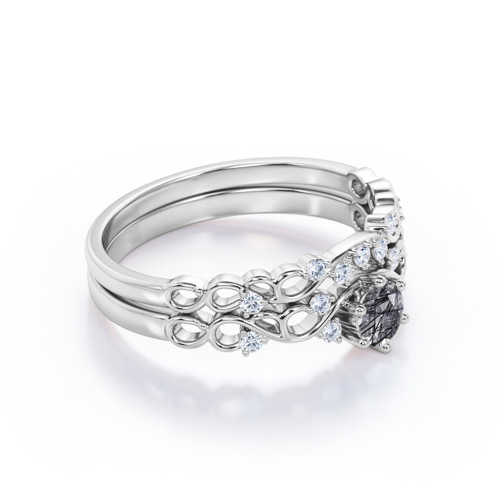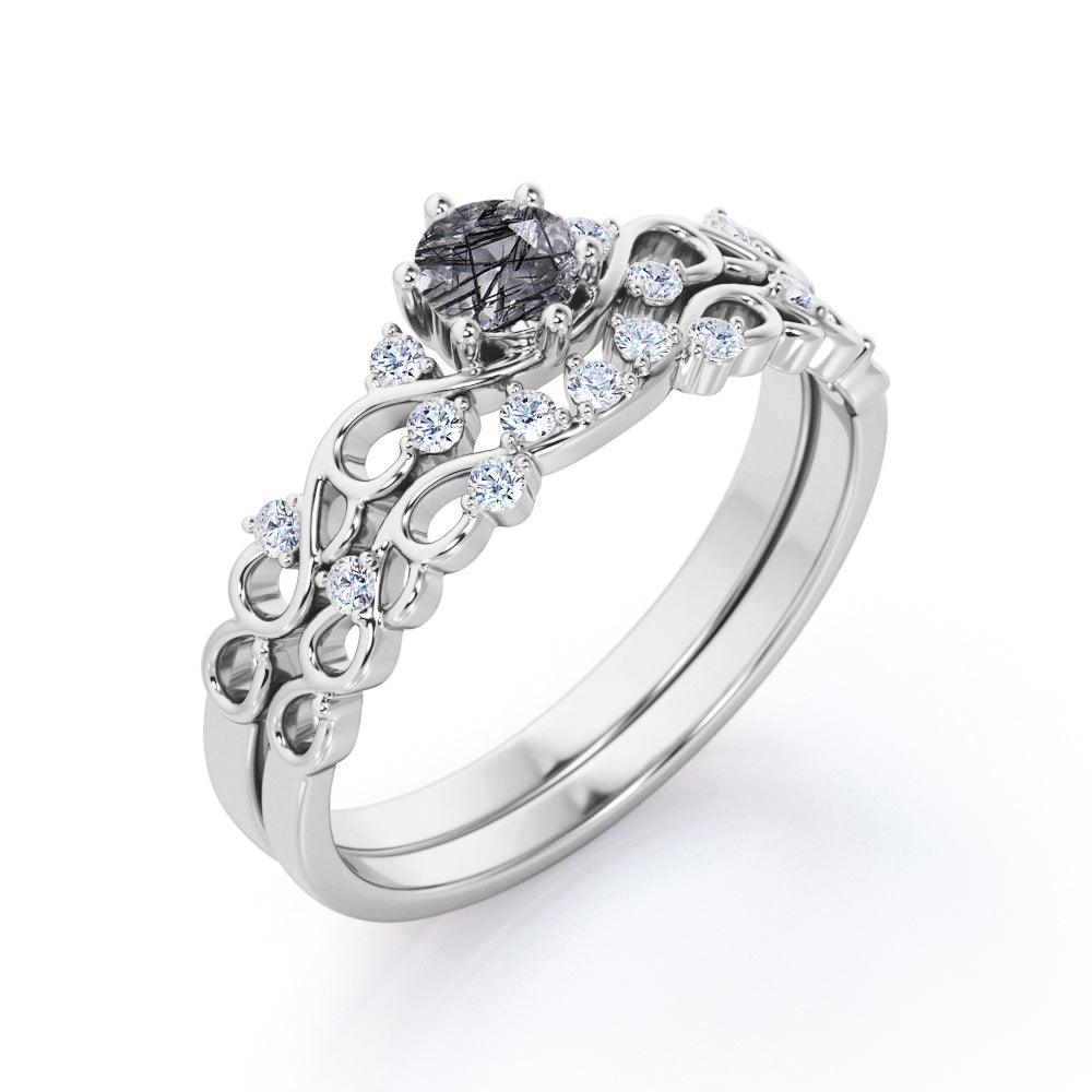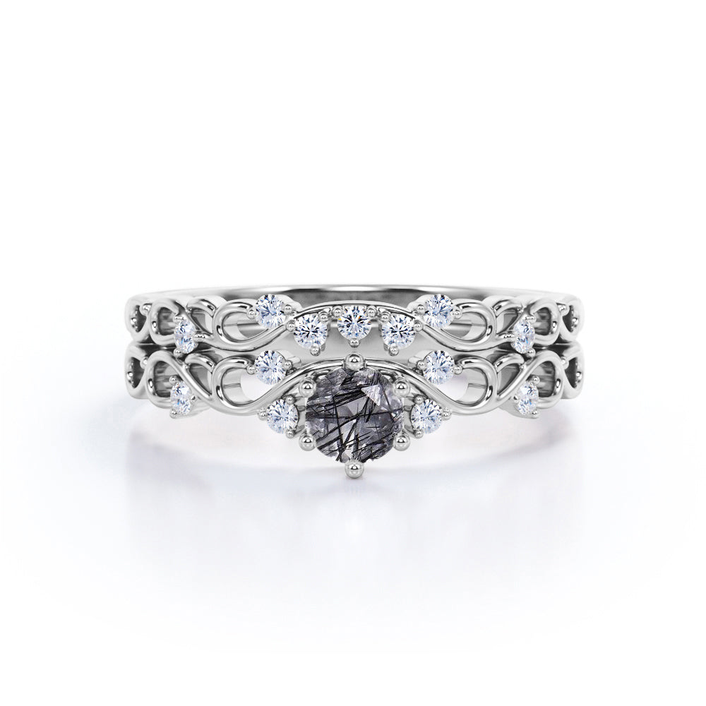 Unique Filigree 0.65 Carat Round Cut Black Needles Rutilated Quartz and Diamond Art Nouveau Wedding Ring Sets