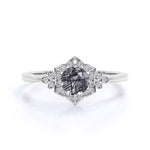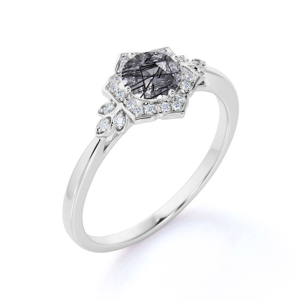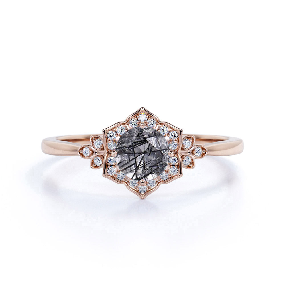 Create an incredibly beautiful look on her finger with this Unique Floral Design 1.25 Carat Round Cut Solid Smoked Black Rutilated Quartz and Diamond Bezel Set Engagement Ring. This nature-inspired flower solid dendritic rutilated quartz engagement ring features 1 carat round cut real rutilated quartz and .25 carat genuine side diamond for gold ring and moissanite for silver ring. This unique bezel setting engagement ring can be customized to either 10k, 14K and Gold over Silver and either Black Gold, Rose Gold, White Gold or Yellow Gold. Also, as your satisfaction is our most priority, we will do our best to have your handmade jewelry be carefully and beautifully crafted by our expert jewelers. The order also comes with a 30-day full refund policy. This clear crystal with black needle inclusions ring will surely be a perfect gift for your significant other. It is crowned as a highly beneficial crystals to aid wearers in manifesting what they are desire into their lives. This tourmalinated black rutilated quartz is believed to be a protection against the ill thoughts of others. The unique dendritic black rutile within its clear quartz will surely complement every style of its wearer. With its distinctive shiny black needles, this genuine druzy rutilated quartz ring is sure to be eye-catching and bring all eyes on you. It can be customized as per your satisfaction and available in both silver and gold metal. While many gemstones are most valuable when they contain few or no inclusions, rutilated quartz is actually prized because of its unique inclusions. Crowned as a powerful heeling stone, this rutilated quartz ring enhances will-power and determination of its wearer. Embellish her finger with this ring which is perfect for any occasion and everyday wear. It is the perfect match for those who are looking for a remarkable gemstone rings as rutilated quartz embodies their own unique intriguing patterns and uplifting meaning.