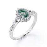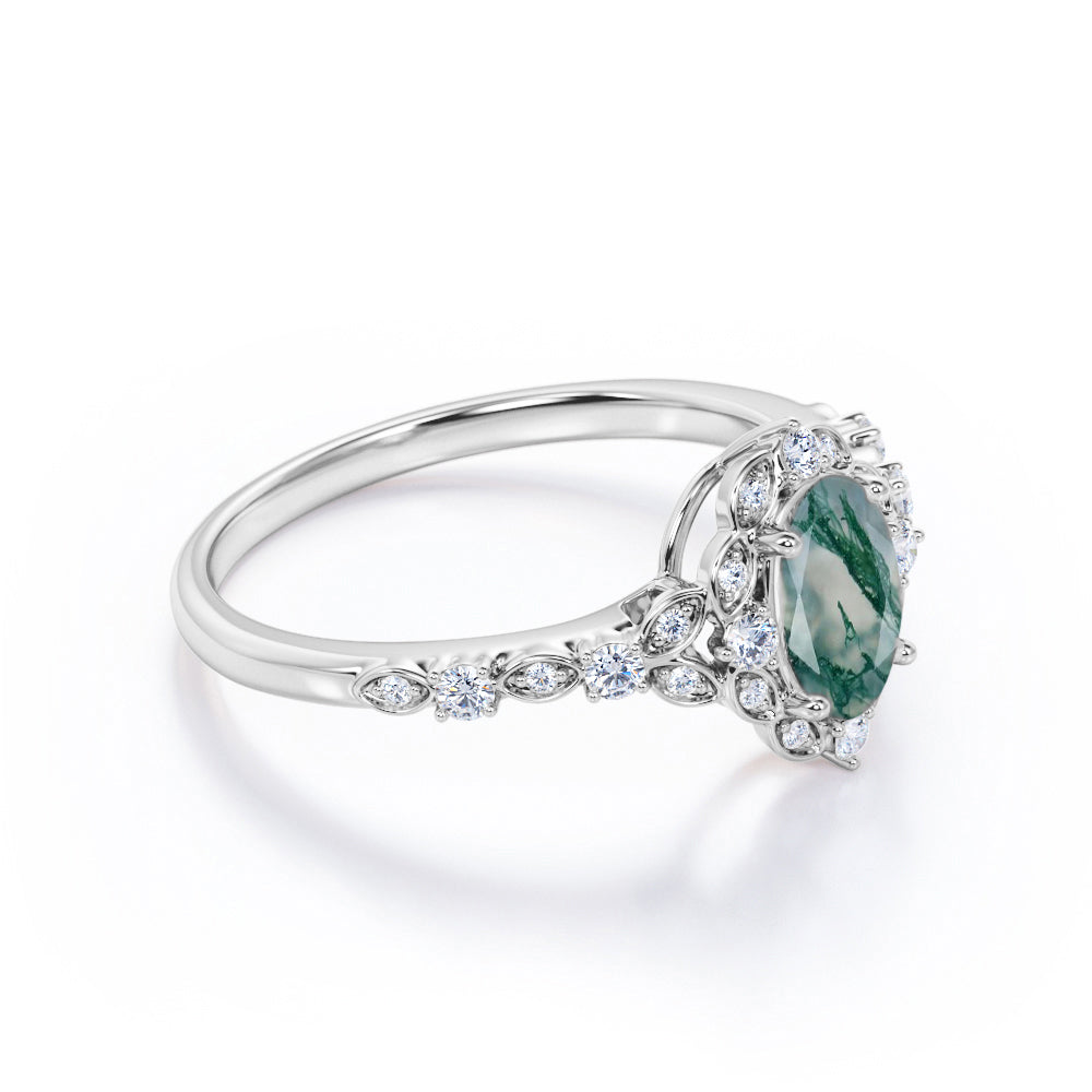 Paint your love story with this Unique Floral Design 1.50 Carat Oval Cut Dendritic Milky White Moss Green Agate and Diamond Art Deco Engagement Ring in Rose Gold. This unique nature-inspired banded moss green Agate engagement ring features 1 carat oval cut real moss green agate and .50 carat real side diamond for gold ring and moissanite for silver ring. This art deco ring can be customized to either 10k, 14K and Gold over Silver and either Black Gold, Rose Gold, White Gold or Yellow Gold. Also, as your satisfaction is our most priority, we will do our best to have your handmade jewelry be carefully and beautifully crafted by our expert jewelers. The order also comes with a 30-day full refund policy. This green colored minerals with banded inclusions ring will surely be a perfect gift for your special someone. It is crowned as a crystal of gardeners and agriculture. Encourage trust and hope with this real green Agate ring that shows a variety of white with green inclusions that resembles moss. Own this ring which displays one of the most unique patterns of color and stand out from the rest. Perfect for everyday wear, this polished veined moss green Agate gemstone is resistant to chemical attack. It can be customized as per your satisfaction and available in both silver and gold metal. It perfectly fit those who are looking for a very unique ring that no two rings are alike. Being considered a very lucky omen, this natural banded moss green Agate ring encourages the gradual growth of what you currently need most in your life. Sparkle your finger with this ring which is perfect for any occasion and everyday wear. Handcrafted with love, this antique ring will complement any style and enhance the charm of its wearer.