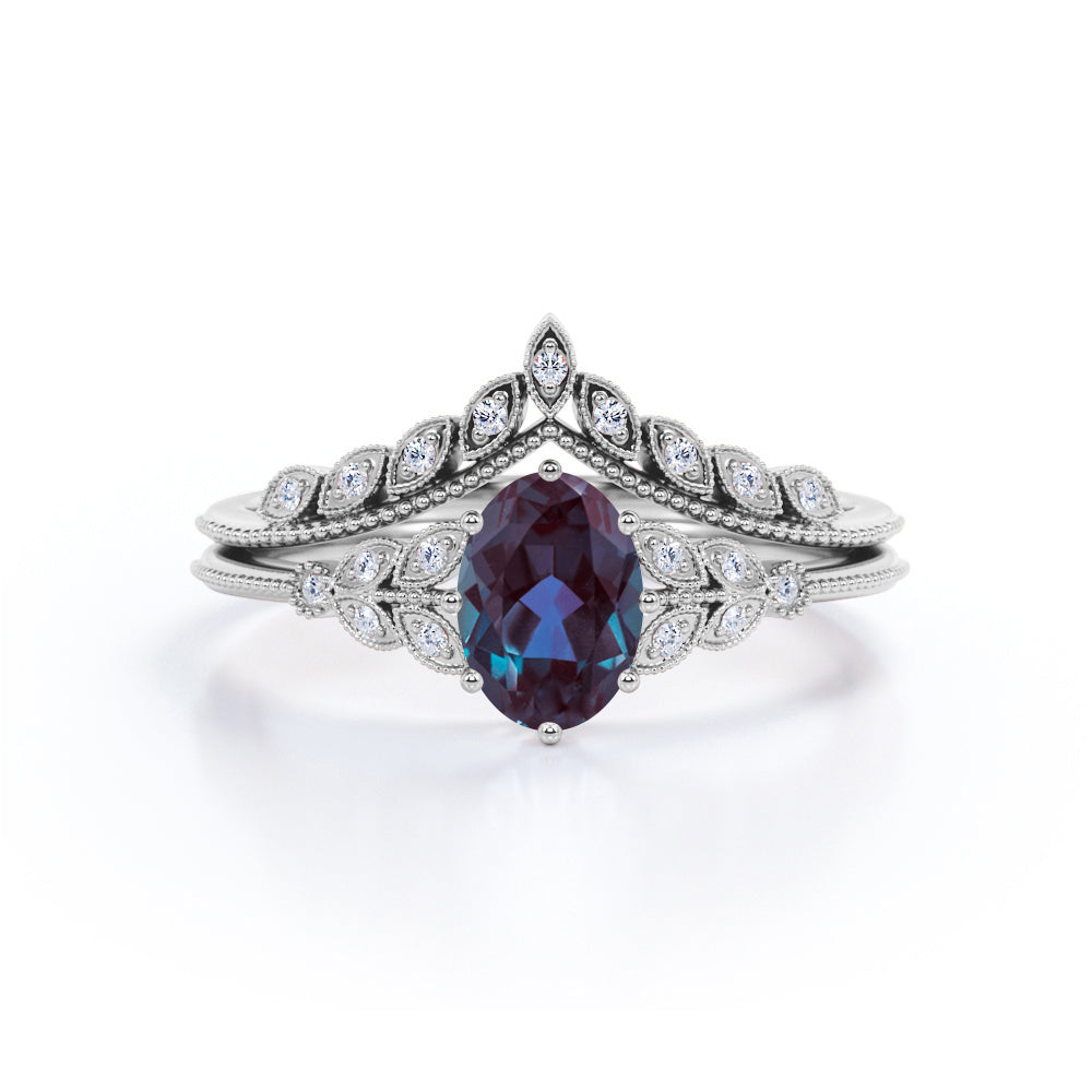 Unique Floral Design 1.50 Carat Oval Cut Lab Made Purple Alexandrite and Diamond Filigree Milgrain Wedding Ring Sets - Bridal Set Rings in White Gold for Women