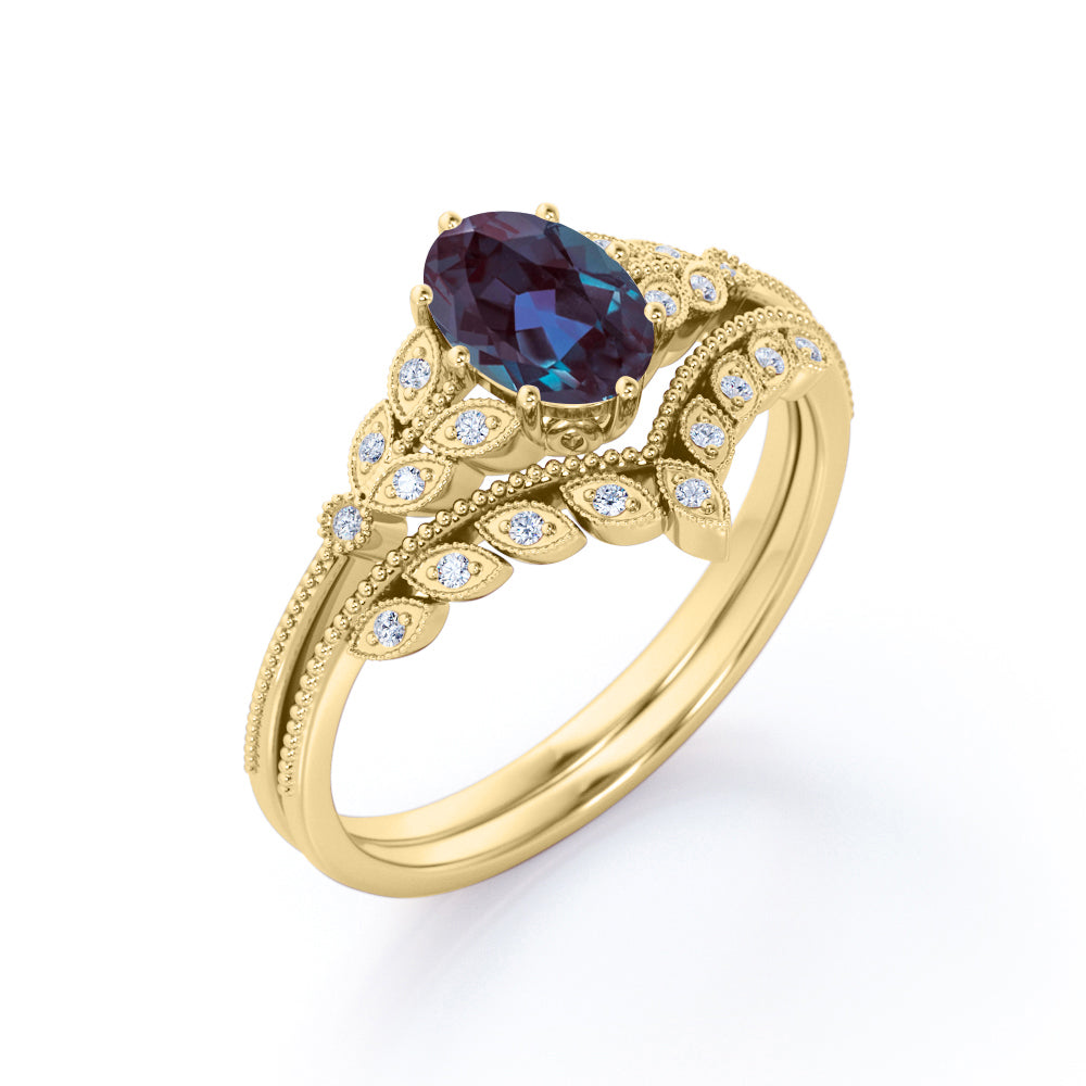 Be on cloud nine with this Unique Floral Design 1.50 Carat Oval Cut Lab Made Purple Alexandrite and Diamond Filigree Milgrain Wedding Ring Sets - Bridal Set Rings in White Gold for Women. This unique flower design synthetic Alexandrite bridal set rings feature 1 carat oval cut lab grown Alexandrite and .50 carat real genuine side diamond for gold ring and moissanite for silver ring. This art deco milgrain Alexandrite wedding ring sets can be customized to either 10k, 14K and Gold over Silver and either Black Gold, Rose Gold, White Gold or Yellow Gold. Also, as your satisfaction is our most priority, we will do our best to have your handmade jewelry be carefully and beautifully crafted by our expert jewelers. The order also comes with a 30-day full refund policy. Perfect for any occasion, this flawless artificial Alexandrite ring can be an ideal gift for anniversary, birthday, proposal, Christmas, Valentines, mother's day and more. Being one of the rarest gemstones in the world, this lab created color changing Alexandrite ring will create a charming and fascinating look on your fingers. This fascinating lab made Alexandrite ring is a perfect match for those who are looking for symbol of luck, hope and good fortune. If you are searching for some alternate gemstone, this Friday's stone lab created Alexandrite ring will be your right choice. This simulated Alexandrite ring gives a vivid grass green color in daylight and displays an intense raspberry red in candescent light. Create a fascinating look on your finger with this lab created Alexandrite ring for women which is available in both solid gold and sterling silver. This ring will bring love and hope to its wearer. This engagement ring will create a timeless and fabulous look on your finger. Sparkle your finger with this mystic lab made Alexandrite ring which is perfect for any occasion and everyday wear. It is the perfect match for those who are looking for a remarkable gemstone rings as Alexandrite embodies their own unique color-change ability and uplifting meaning.