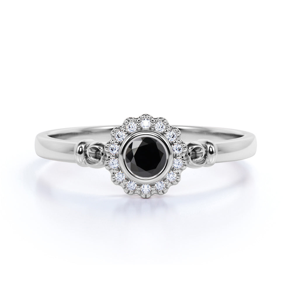 Unique Flower 1 Carat Round Lab Black Diamond and Halo Engagement Ring in White Gold