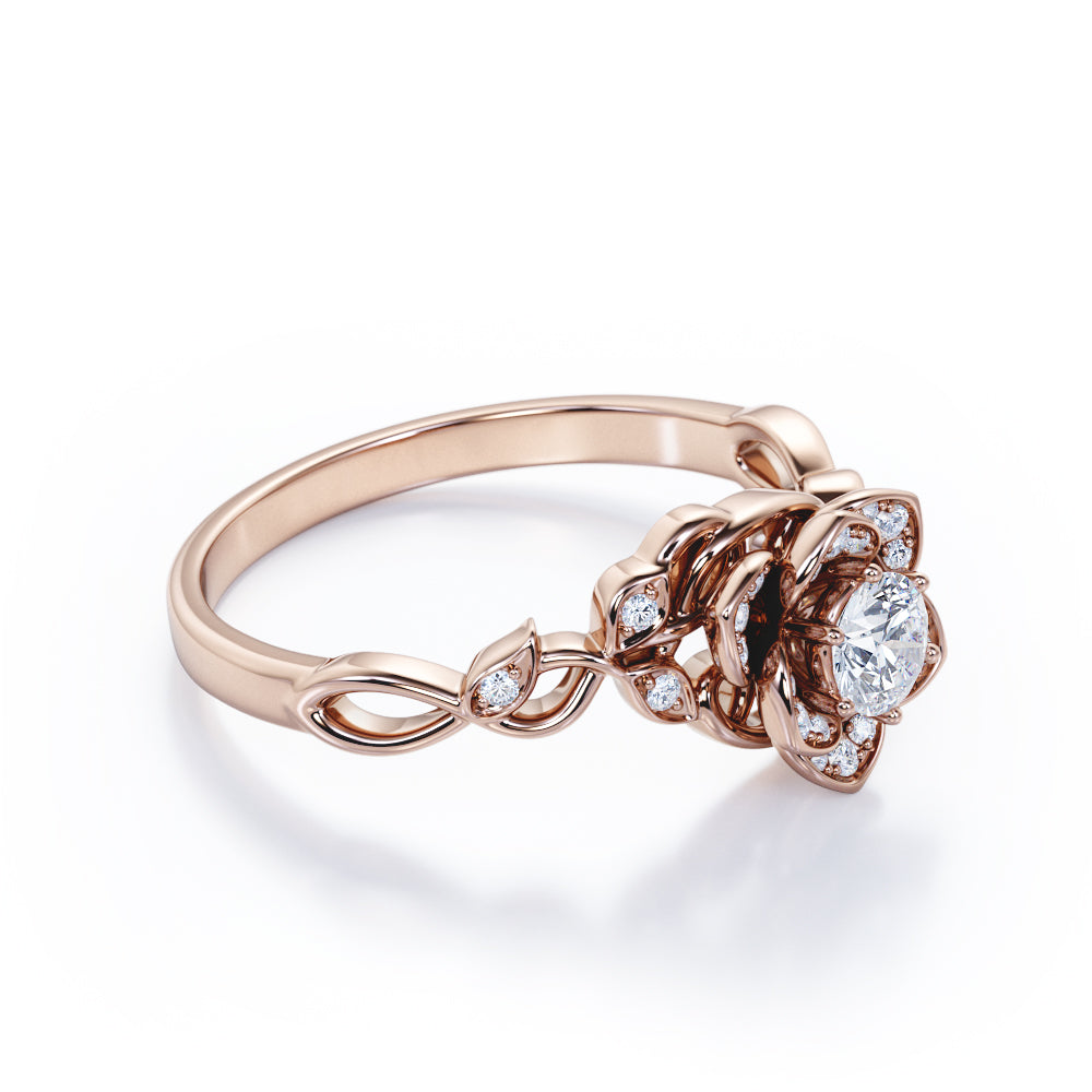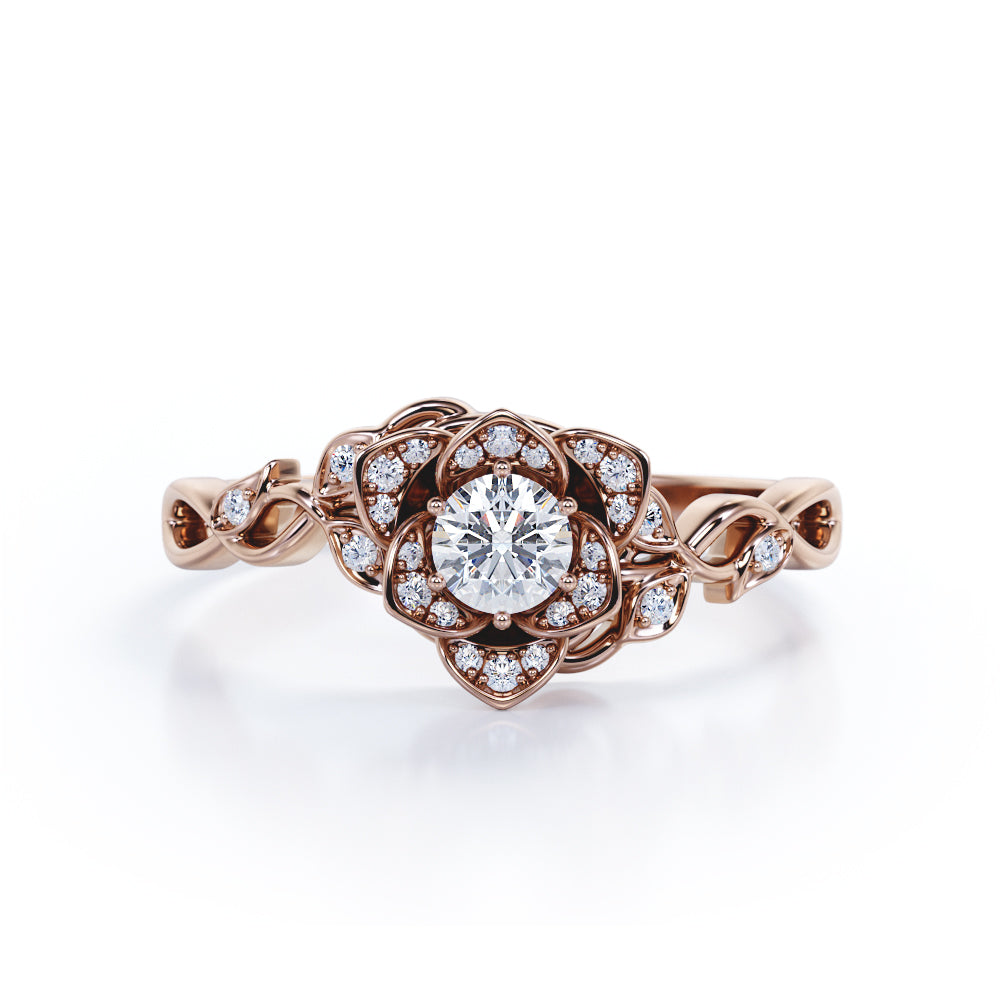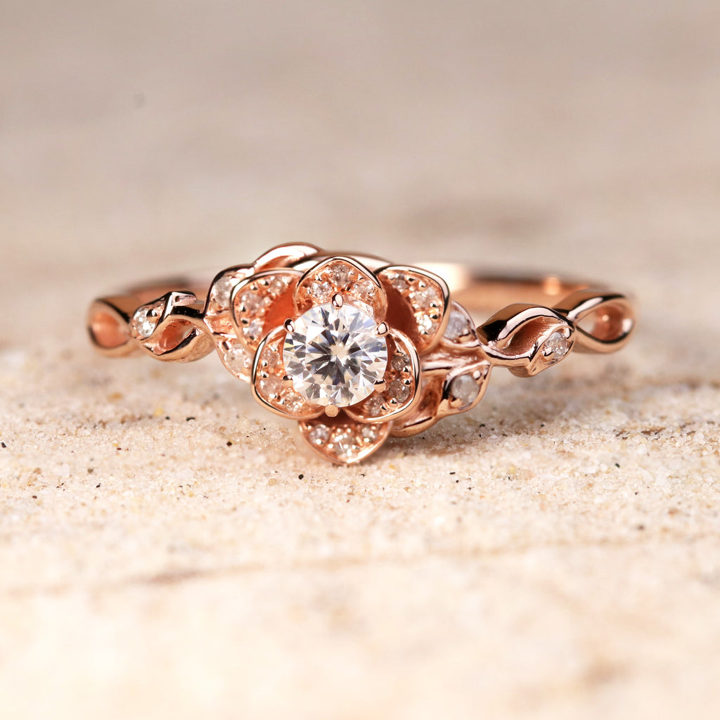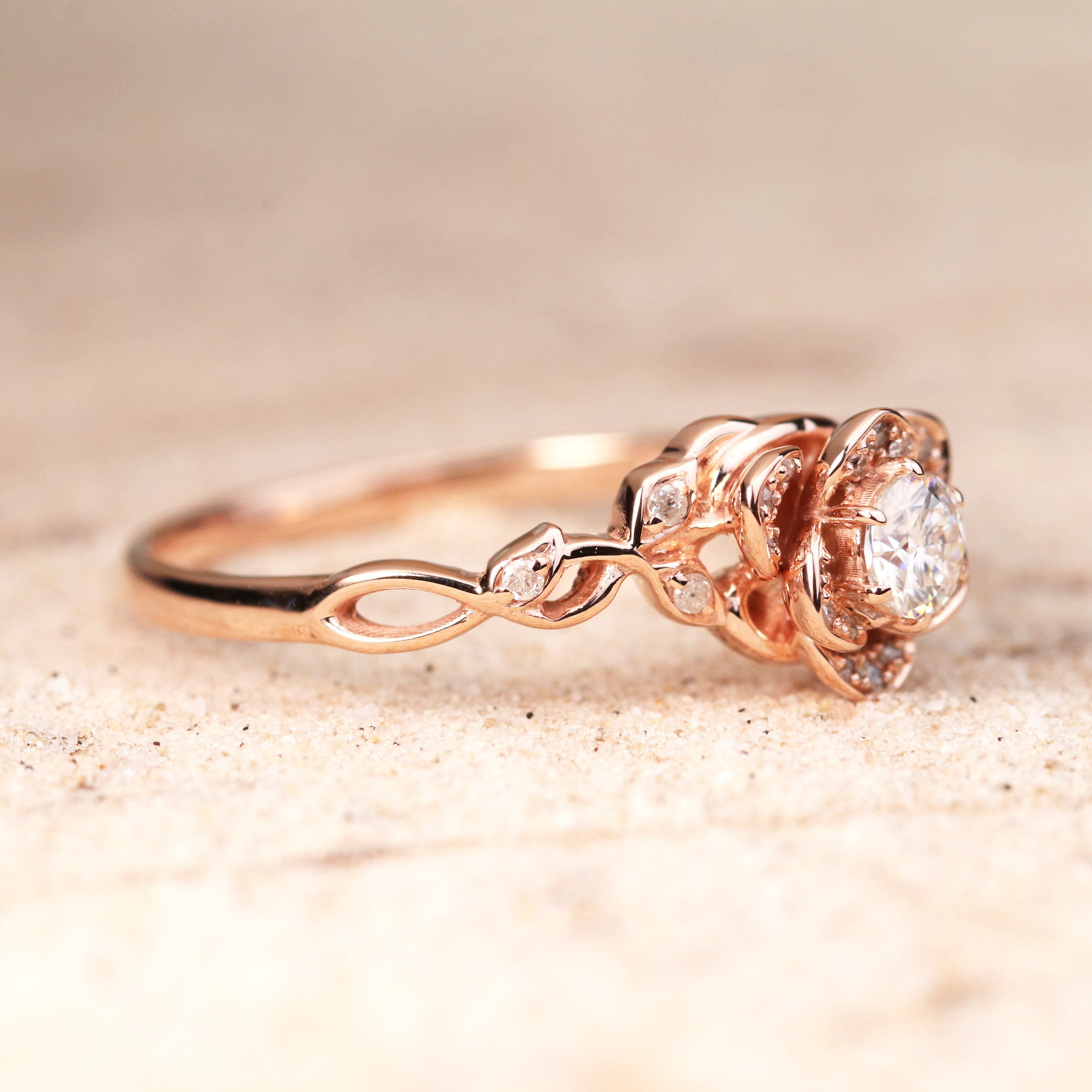 Flower Rose Cluster 0.5 Carat Round Moissanite and Diamond Bezel Set Engagement Ring in Rose Gold