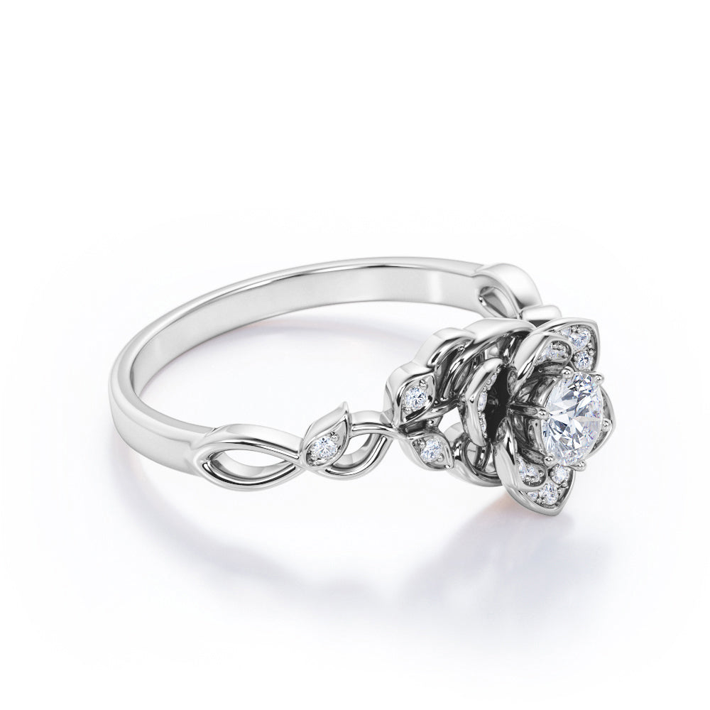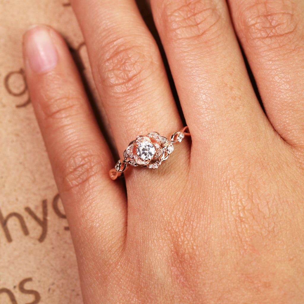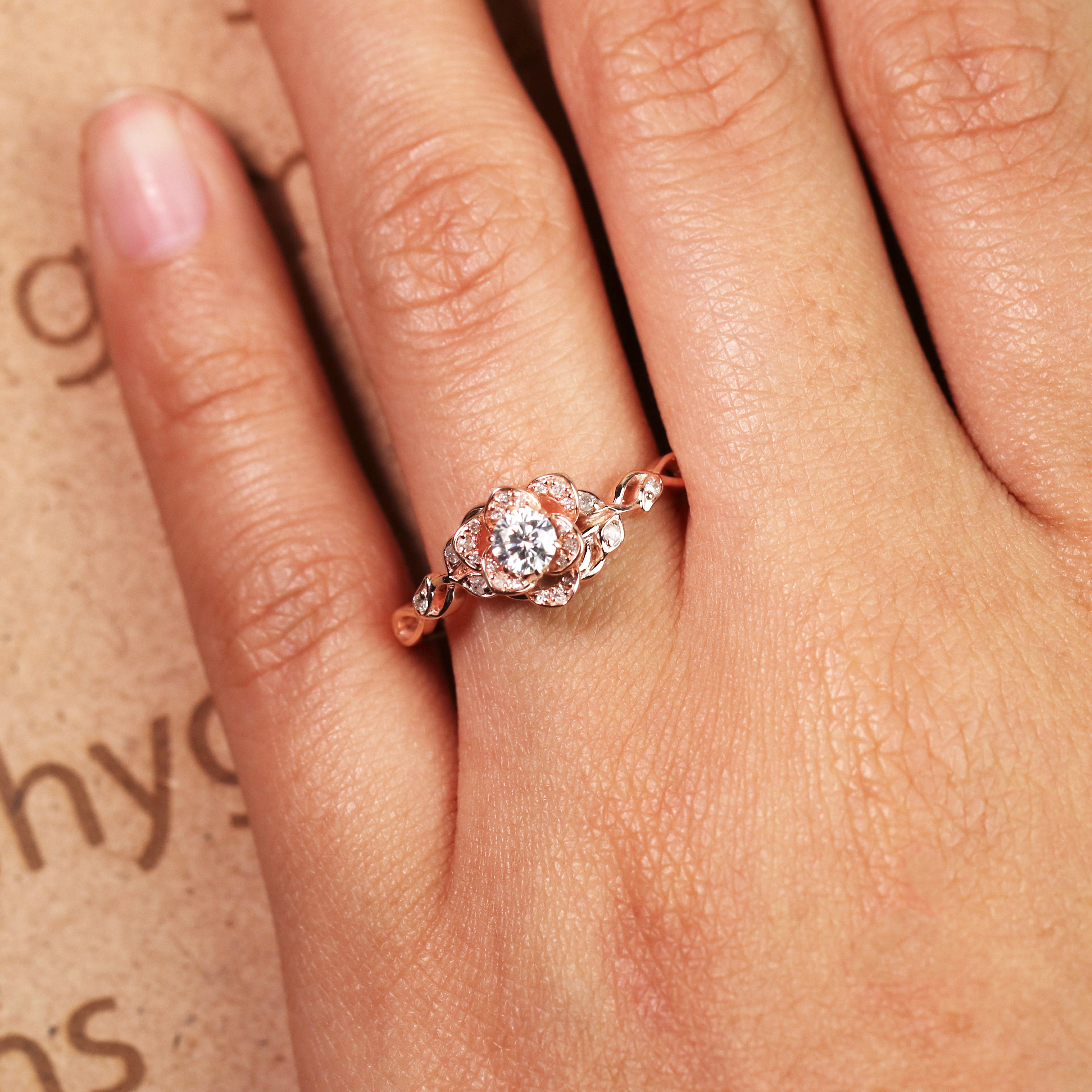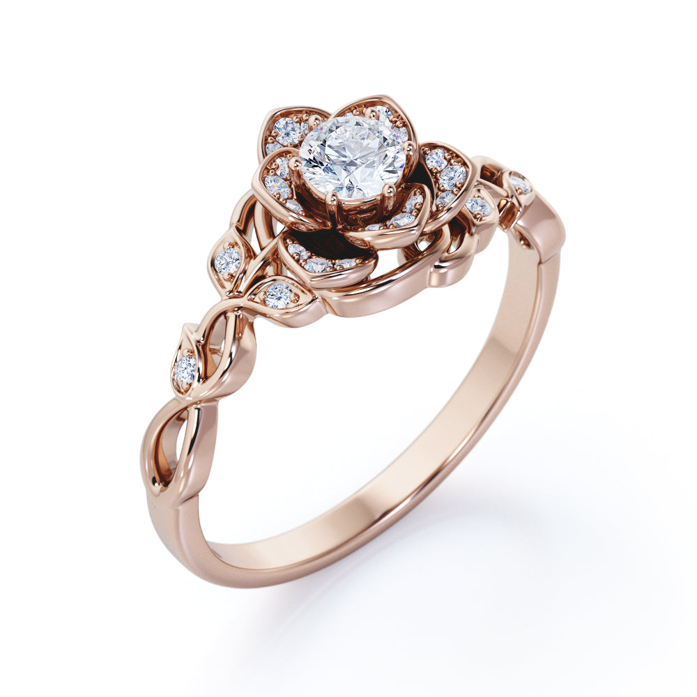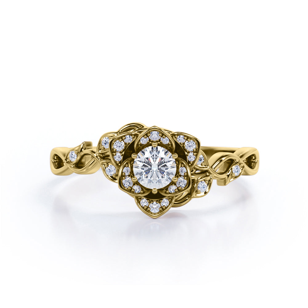 Flower Rose Cluster 0.5 Carat Round Moissanite and Diamond Bezel Set Engagement Ring in Rose Gold