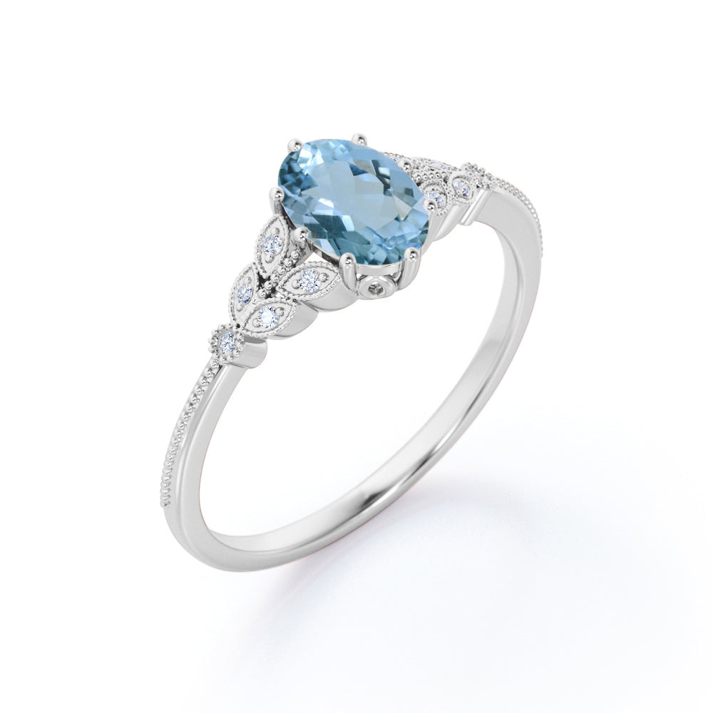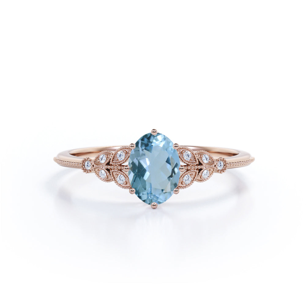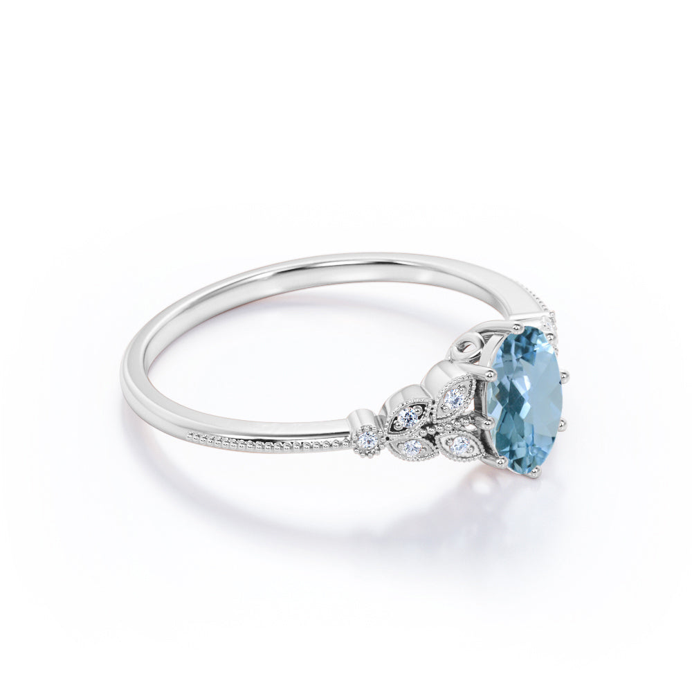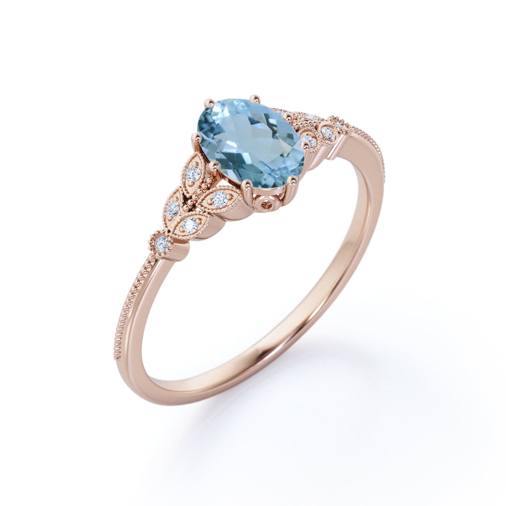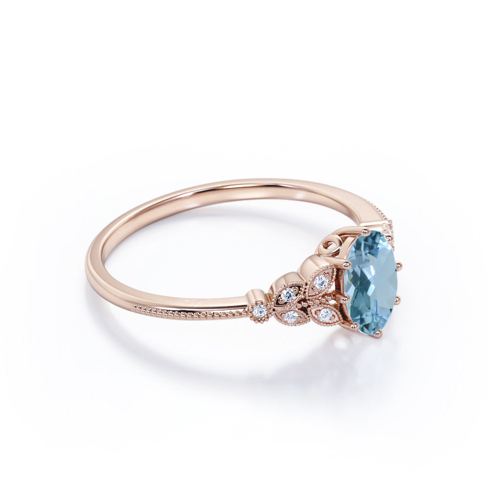 Unique Flower Style 1.50 Carat Oval Cut Natural Deep Blue Aquamarine and Diamond Marquise Dot Milgrain Art Deco Engagement Ring in Rose Gold