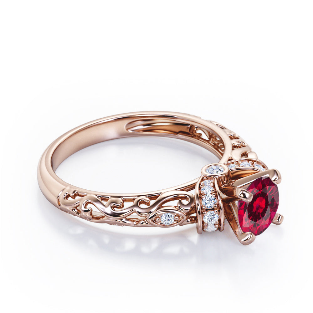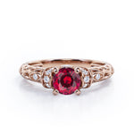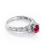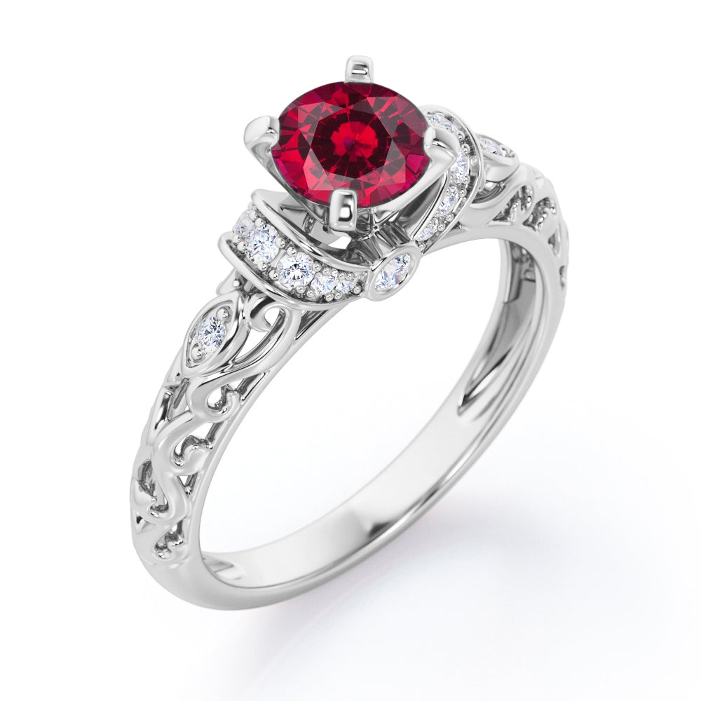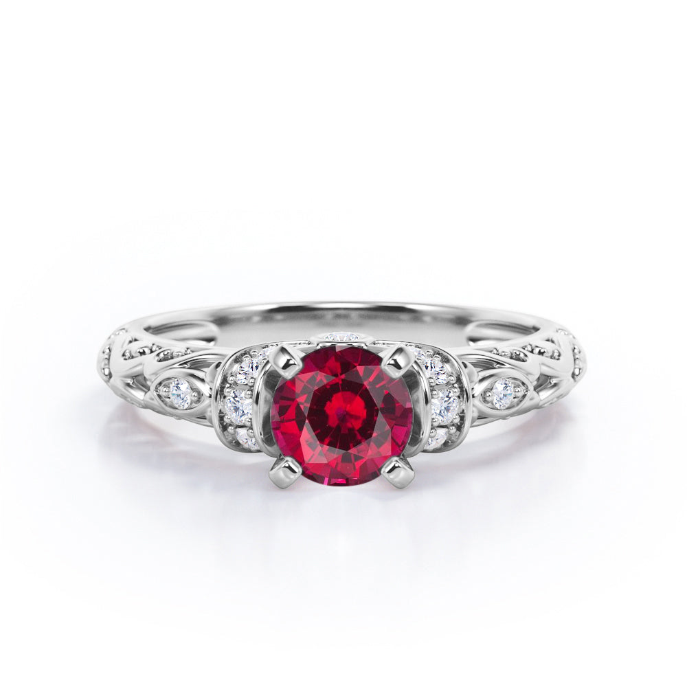 Unique Four Prong 1.15 Carat Round Cut Lab-Created Ruby And Diamond Art Deco Engagement Ring In White Gold. Select a piece that reflects you, that you want to wear to celebrate your love and pass down to someone special one day. This ruby and diamond engagement ring will create a timeless look on your finger. This antique engagement ring features 1 carat round shaped Lab-Created ruby at the center and 0.15 carat of dainty round cut white diamonds set on a plating around the center stone. Customizing your very own ring is the best way to get the look you love at a price point that works for you. As all our products are handmade by our experienced artisans, this unique four prong 1.15 carat round cut ruby and diamond art deco engagement ring in white gold can also be customized to 18k Gold plating over silver, 10k Gold or 14k Gold as per your preference. Please note that if the ring is made over silver, the side stone will be moissanite and if it is made on gold, diamond will be engraved as the side stone.