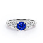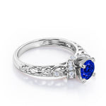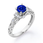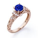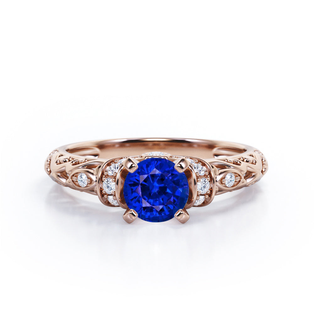 Unique Four Prong 1.15 Carat Round Cut Sapphire And Diamond Art Deco Engagement Ring In Rose Gold. Select a piece that reflects you, that you want to wear to celebrate your love and pass down to someone special one day. This Sapphire and diamond engagement ring will create a timeless look on your finger. This antique engagement ring features 1 carat round shaped sapphire at the center and 0.15 carat of dainty round cut white diamonds set on a plating around the center stone. Customizing your very own ring is the best way to get the look you love at a price point that works for you. As all our products are handmade by our experienced artisans, this unique four prong 1.15 carat round cut sapphire and diamond art deco engagement ring in rose gold can also be customized to 18k Gold plating over silver, 10k Gold or 14k Gold as per your preference. Please note that if the ring is made over silver, the side stone will be moissanite and if it is made on gold, diamond will be engraved as the side stone.