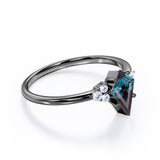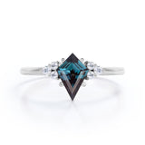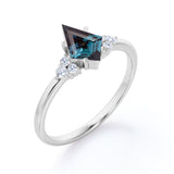 Unique Four Prong 1 Carat Kite Shaped Lab Created Alexandrite And Diamond Seven Stone Engagement Ring In White Gold. If your goal is an engagement ring that looks nothing like your traditional engagement ring, then this one is an ideal choice. Four prong set kite shaped diamond in a white gold plain shank looks classic, clean, and totally wedding-worthy. This seven stone ring features 0.85 carat lab made alexandrite at the center accompanied by three set of brilliant round cut diamonds of 0.15 on either side making this an exceptional piece of art. This unique four prong 1 carat kite shaped lab created alexandrite and diamond seven stone engagement ring in white gold can also be customized in 18k Gold plating over silver, 10k Gold or 14k Gold depending upon your choice. Grab it now before it gets sold out.