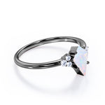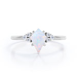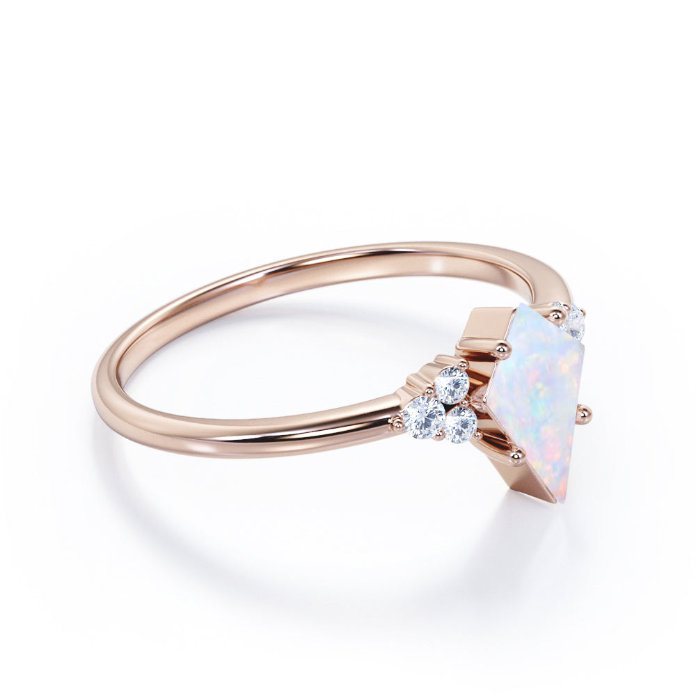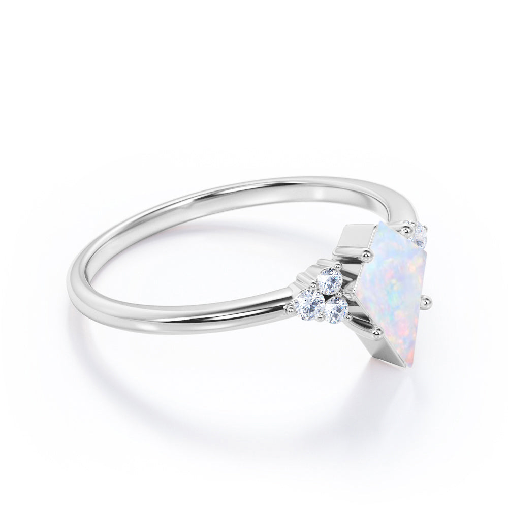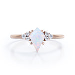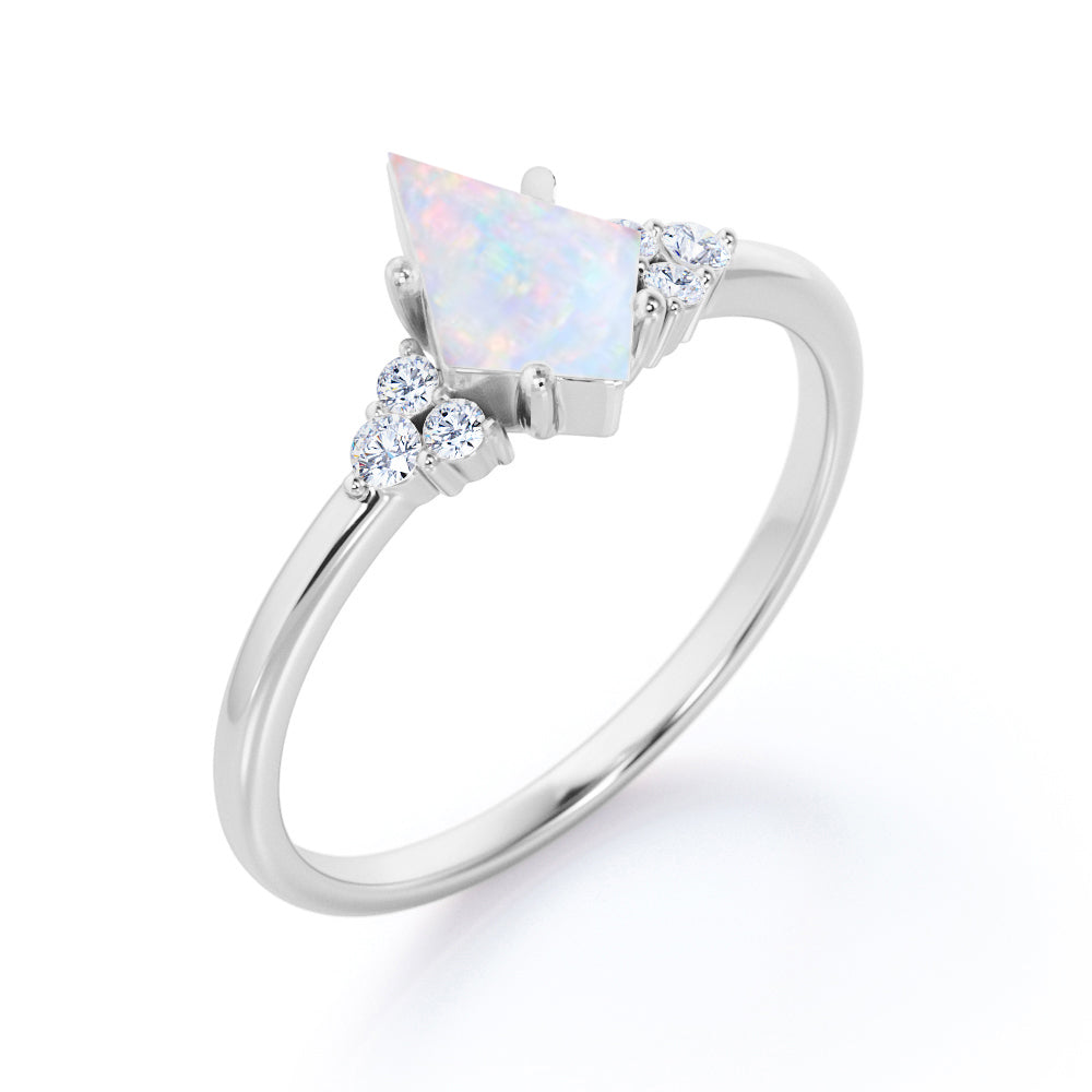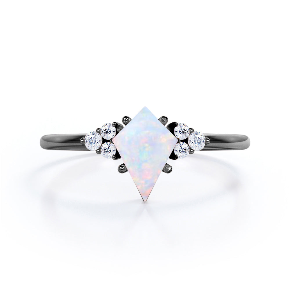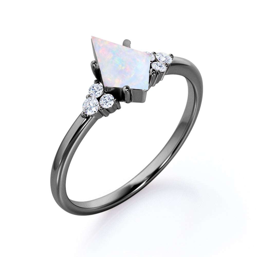 Unique Four Prong 1.30 Carat Kite Shaped Precious Fire Opal And Diamond Seven Stone Engagement Ring In Black Gold. If your goal is an engagement ring that looks nothing like your traditional engagement ring, then this one is an ideal choice you should go for. Four prong set kite shaped opal in a white gold plain shank looks classic, clean, and totally wedding-worthy. This seven stone ring features 1 carat natural opal at the center accompanied by three set of brilliant round cut diamonds of 0.3 on either side making this an exceptional piece of art. Handmade with sincere love and devotion by our well-experienced craftsmen, this unique four prong 1.30 carat kite shaped precious fire opal and diamond seven stone engagement ring in black gold can also be customized into 18k Gold plating over silver, 10k Gold or 14k Gold depending upon your choice. Grab it now before it gets sold out to be that unique bride.