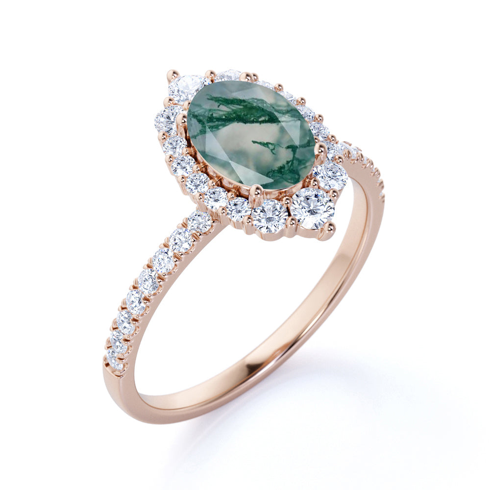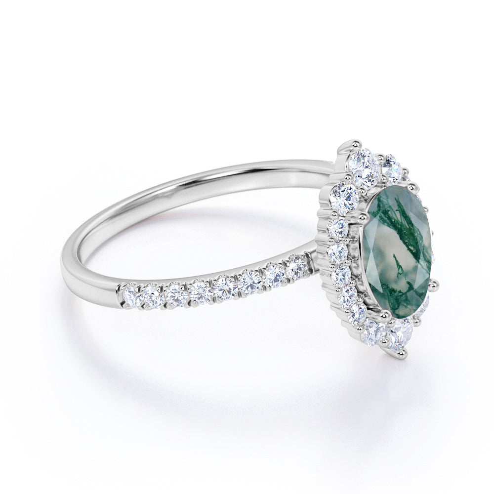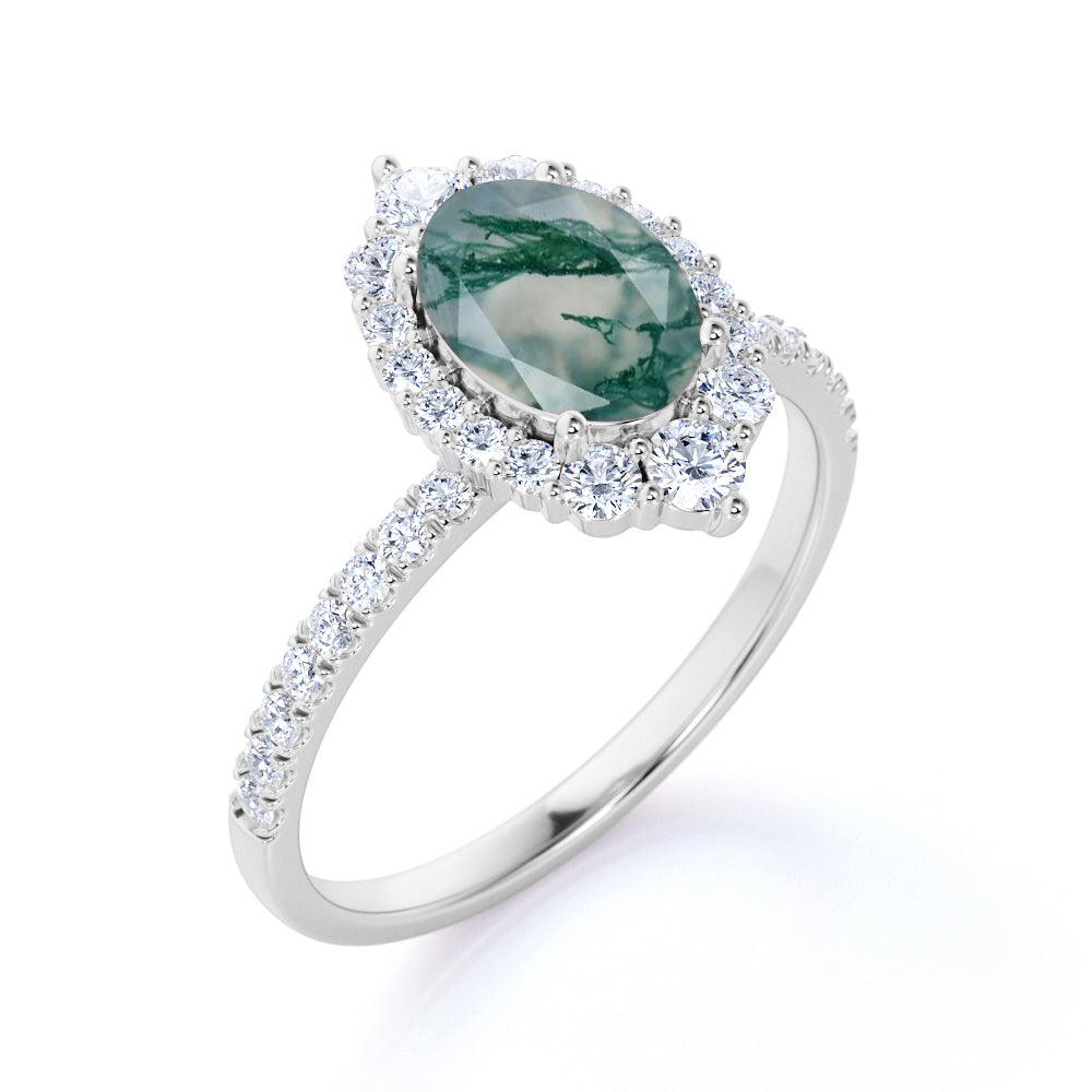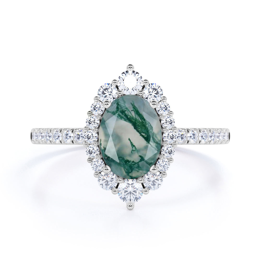 Paint your love story with this Unique Halo Cluster 1.50 Carat Oval Cut Natural Druzy Moss Green Agate and Diamond Semi Eternity Pave Engagement Ring in White Gold for Ladies. This unique pave stone green Agate engagement ring features 1 carat oval cut real moss green agate and .50 carat real side diamond for gold ring and moissanite for silver ring. This halo cluster engagement ring can be customized to either 10k, 14K and Gold over Silver and either Black Gold, Rose Gold, White Gold or Yellow Gold. Also, as your satisfaction is our most priority, we will do our best to have your handmade jewelry be carefully and beautifully crafted by our expert jewelers. The order also comes with a 30-day full refund policy. This green colored minerals with banded inclusions ring will surely be a perfect gift for your special someone. It is believed to bring abundance in wealth and improve self-esteem. Encourage trust and hope with this real green Agate ring that shows a variety of white with green inclusions that resembles moss. Own this ring which displays one of the most unique patterns of color and stand out from the rest. Perfect for everyday wear, this polished veined moss green Agate gemstone is resistant to chemical attack. Create a fascinating look on your finger with this moss green Agate ring which is available in both solid gold and sterling silver. With its moss-like inclusions, this ring will make you shine and stand out from others. Being named a growth crystal, this real dendritic moss green Agate encourages spiritual growth and renewed commitment to a higher purpose. Sparkle your finger with this ring which is perfect for any occasion and everyday wear. With its mesmerizing patters of colors and inclusions, this Agate ring will enchant your special someone with gracefulness.