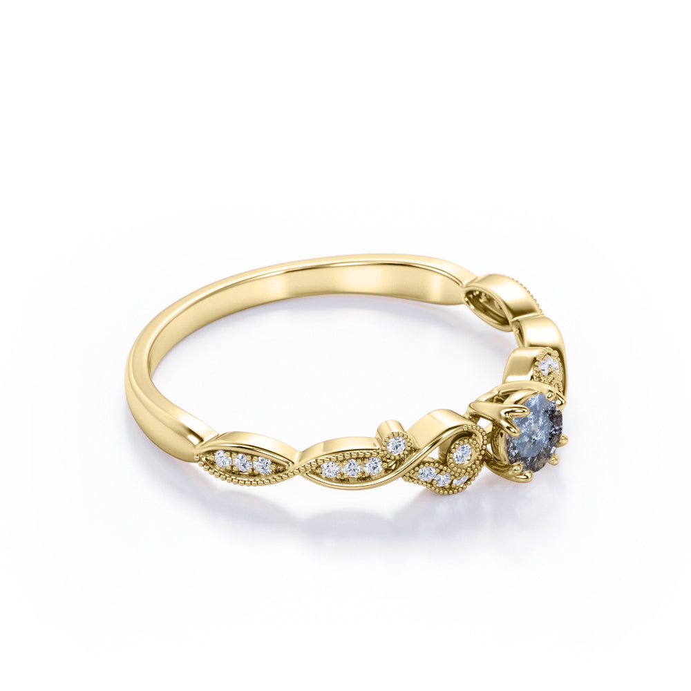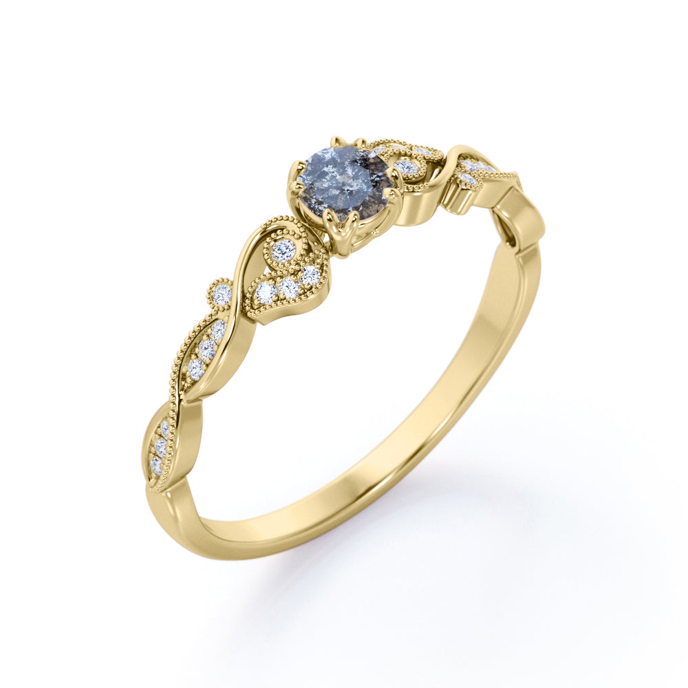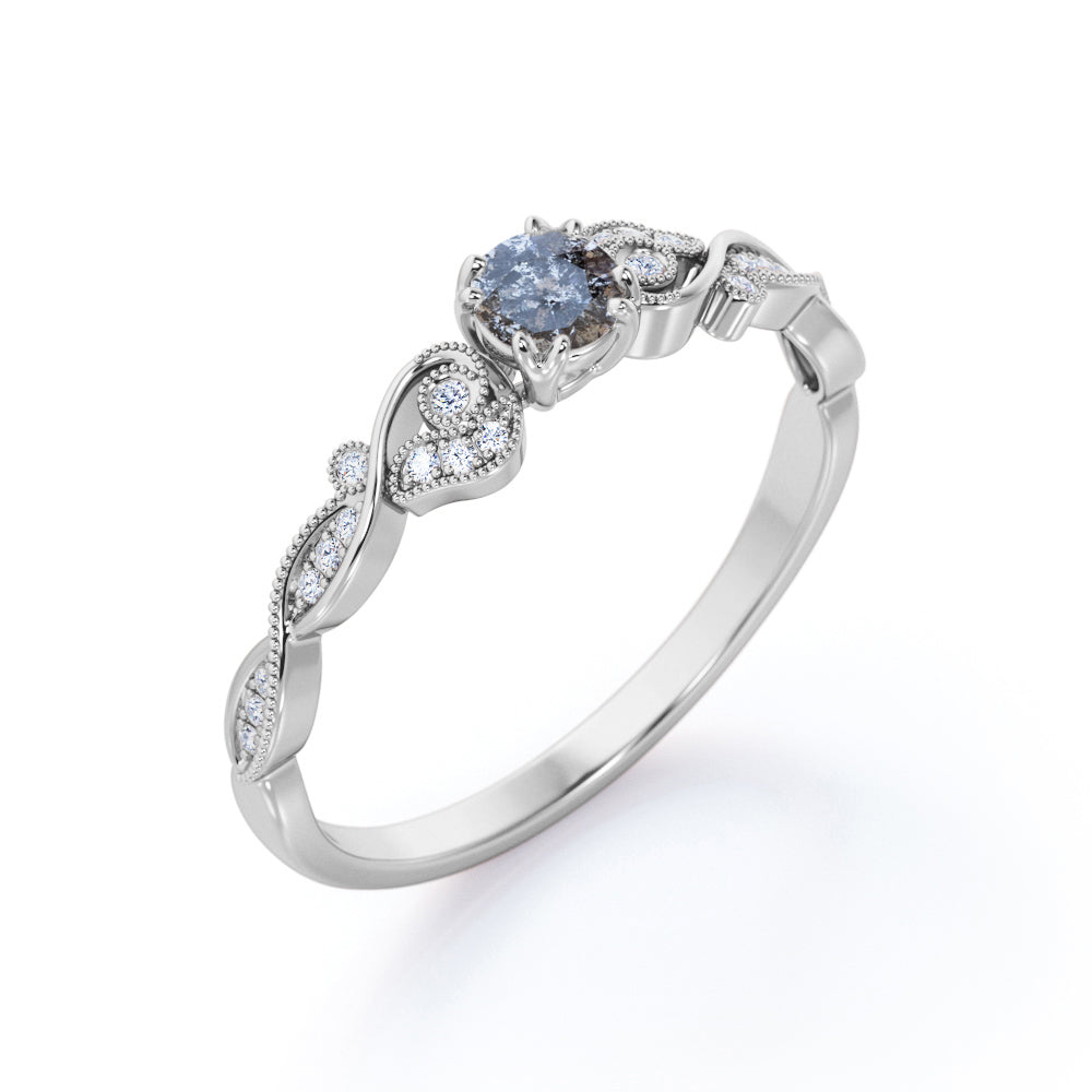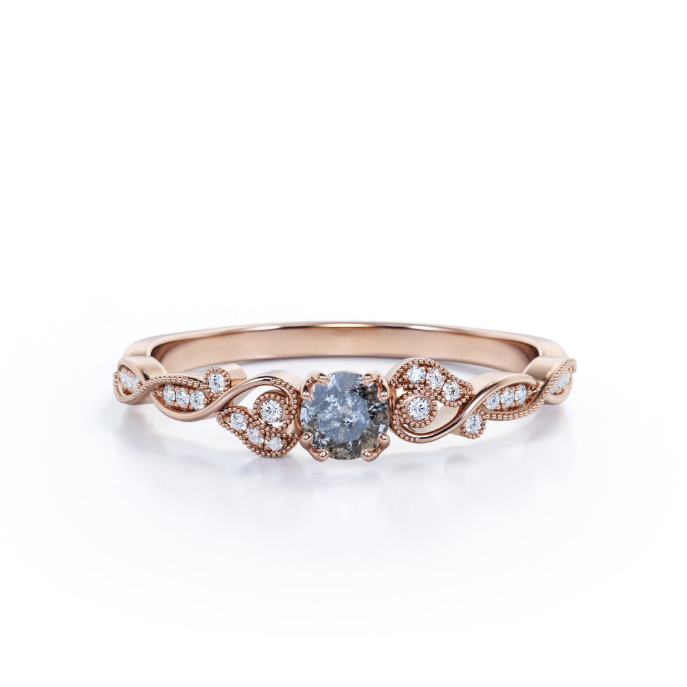 IMPORTANT NOTE: Since each Salt and Pepper Diamonds is one of a kind, the actual color of it may vary from the one that is pictured above. Make her feel special with this Unique Leaf Design 0.50 Carat Round Cut Fancy Icy Grey Salt and Pepper Diamond Art Deco Engagement Ring in Rose Gold for Women. This nature-inspired leaf design fancy icy grey Salt and Pepper Diamond engagement ring features .25 carat round cut natural Salt and Pepper Diamond and .25 carat real side diamond for gold ring and moissanite for silver ring. This unique art deco Salt and Pepper engagement ring can be customized to either 10k, 14K and Gold over Silver and either Black Gold, Rose Gold, White Gold or Yellow Gold. Also, as your satisfaction is our most priority, we will do our best to have your handmade jewelry be carefully and beautifully crafted by our expert jewelers. The order also comes with a 30-day full refund policy. Enrich your charm and charisma with this vintage dark grey Salt and Pepper Diamond ring for women that is excellent for everyday wear. With its unique appearance, this unique dark gery Salt and Pepper Diamond ring will create a charming and fascinating look on your fingers. With no two diamonds exactly alike, Salt and Pepper Diamond gives each ring character and style. If you are looking for alternate gemstone, this Salt and Pepper Diamond is right for you. Salt and Pepper Diamonds provide an ideal way to stand out from crowd with a gorgeous and distinctive ring. Its inclusions will distinguish your ring offering a unqie look on your finger . Diversity of Salt and Pepper provides additional character to your traditional engagement ring. Design and create your very own unique Salt and Pepper Diamond ring that makes you outstanding from the rest! Those who has a penchant for vintage and flawless ring would completely fall in love with this affordable ring. With its mesmerizing salt and pepper inclusions, it is sure to enchant your special someone with gracefulness.