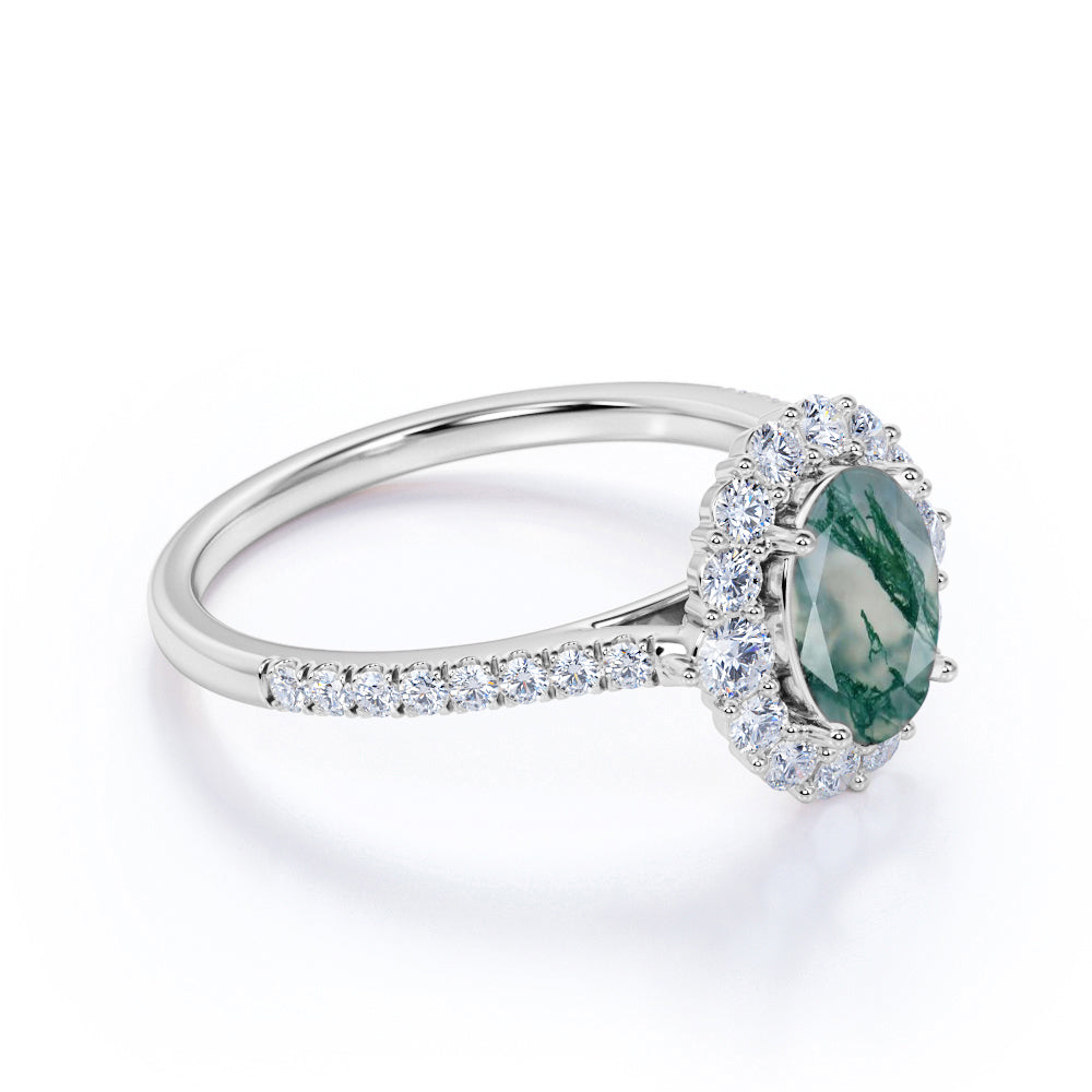 Halo Cluster 1.50 ct Oval Moss Agate Engagement Ring