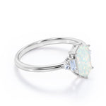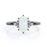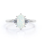 Unique Six Prong Basket Set 1.15 Carat Hexagon Shaped White Fire Opal And Diamond Five Stone Engagement Ring In White Gold. With a design that’s decidedly chic and modern, this engagement ring has a geometric design. A hexagon shaped opal as the center stone gives this modern style a geometric twist. Made with an assortment of side diamonds in two bauguette and two round cuts and sizes, this exquisite piece is interesting to look at and often feels unexpected. One carat hexagon cut opal held by six prongs is basket set at the center and is accompanied by 0.15 carat white diamonds as the side stone This five stone ring is believed to bring love and hope to its wearer. As all of our products are handmade by our experienced artisans, this unique six prong basket set 1.15 carat hexagon shaped white fire opal and diamond five stone engagement ring in white gold can also be customized to 18k Gold plating over silver, 10k Gold or 14k Gold as per your preference.
