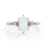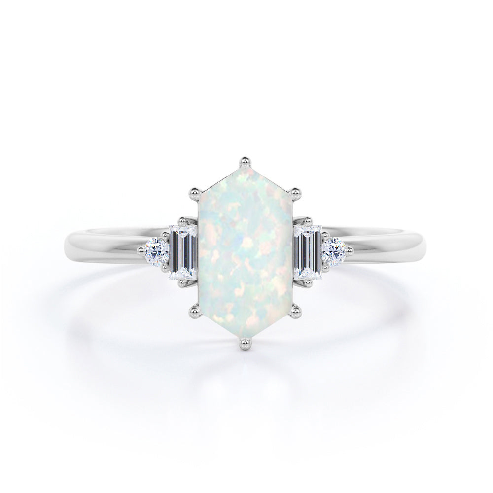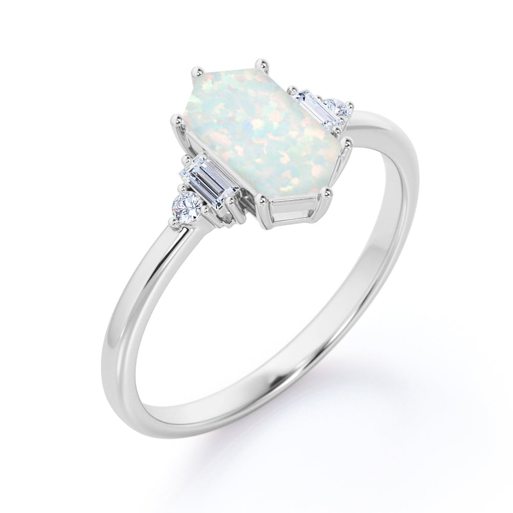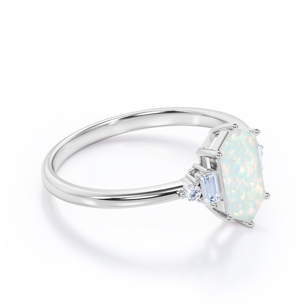 Unique Six Prong Basket Set 1.15 Carat Hexagon Shaped White Fire Opal And Diamond Five Stone Engagement Ring In White Gold.