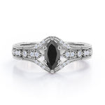 Unique Six Prongs 1.25 Carat Marquise Cut Black Diamond Vintage Filigree Engagement Ring In White Gold. Looking for something extra and distinctive to stand out from others? Then look no further, presenting our unique marquise cut black diamond engagement ring which might be exactly what you are looking for. This vintage engagement ring features 1 carat marquise shaped black diamond set in six prongs and 0.25 carat white sizzling diamonds including the band in White gold. This vintage inspired engagement ring features antique art deco and lattice filigree art in the band. The pave set diamonds in the wedding band radiates unbeleivable sparkle and great brilliance. This unique six prongs 1.25 carat marquise cut black diamond vintage filigree engagement ring in white gold can also be customized to 10k Gold or 14k Gold as per your choice. So hurry up and make it all yours forever by simply pressing the add to cart button below.