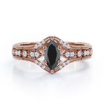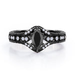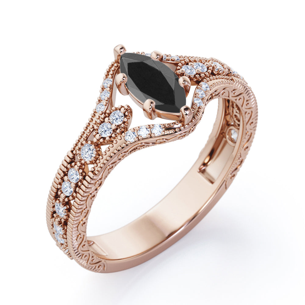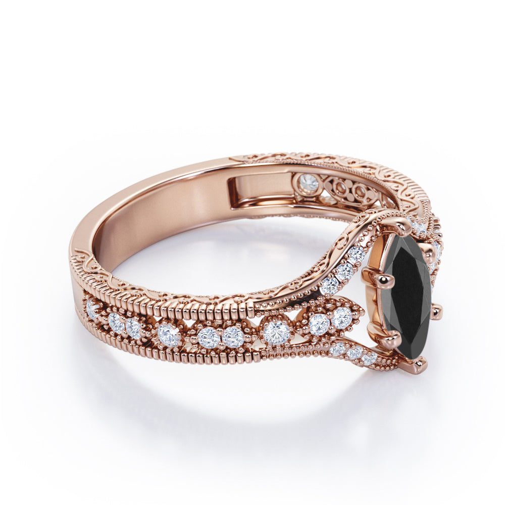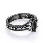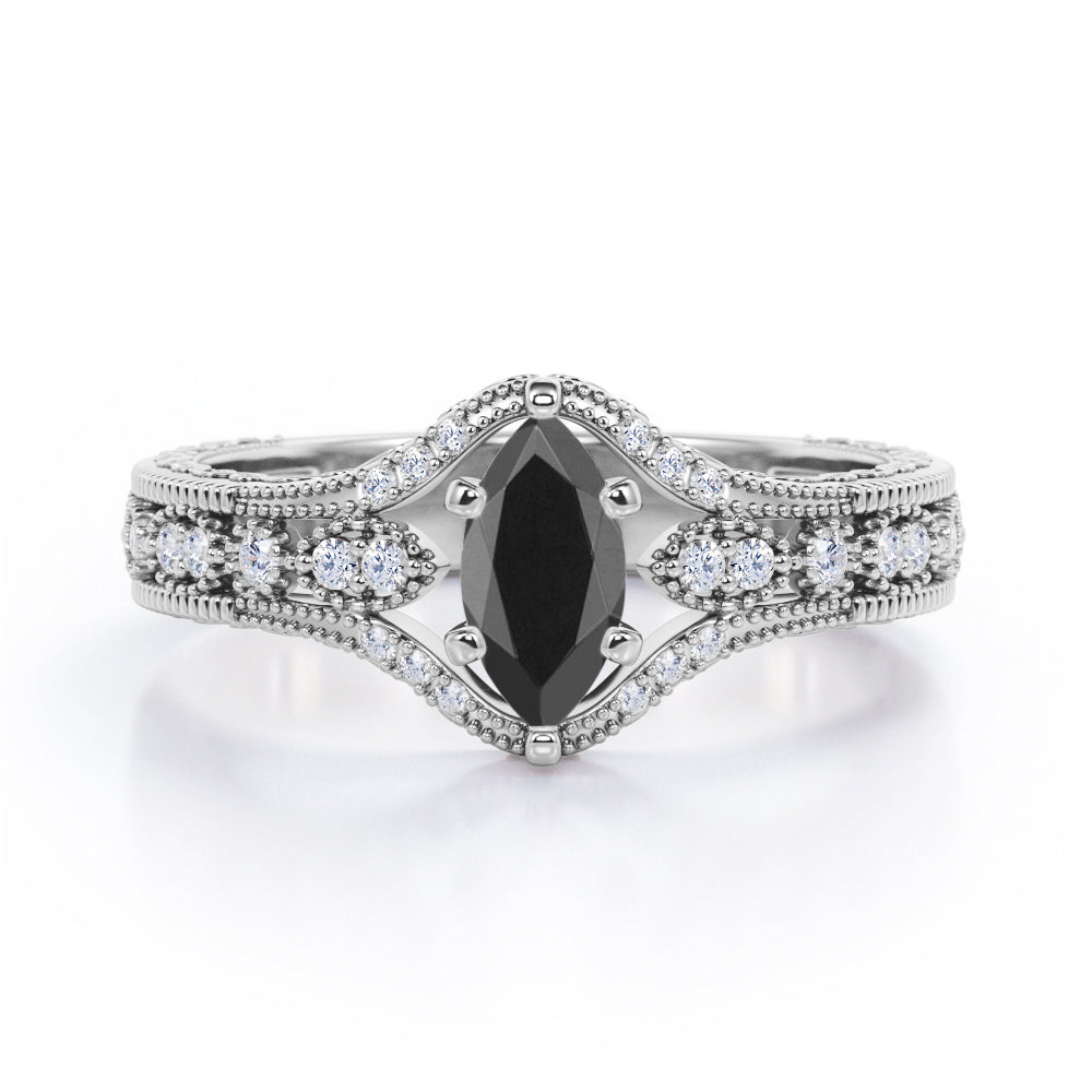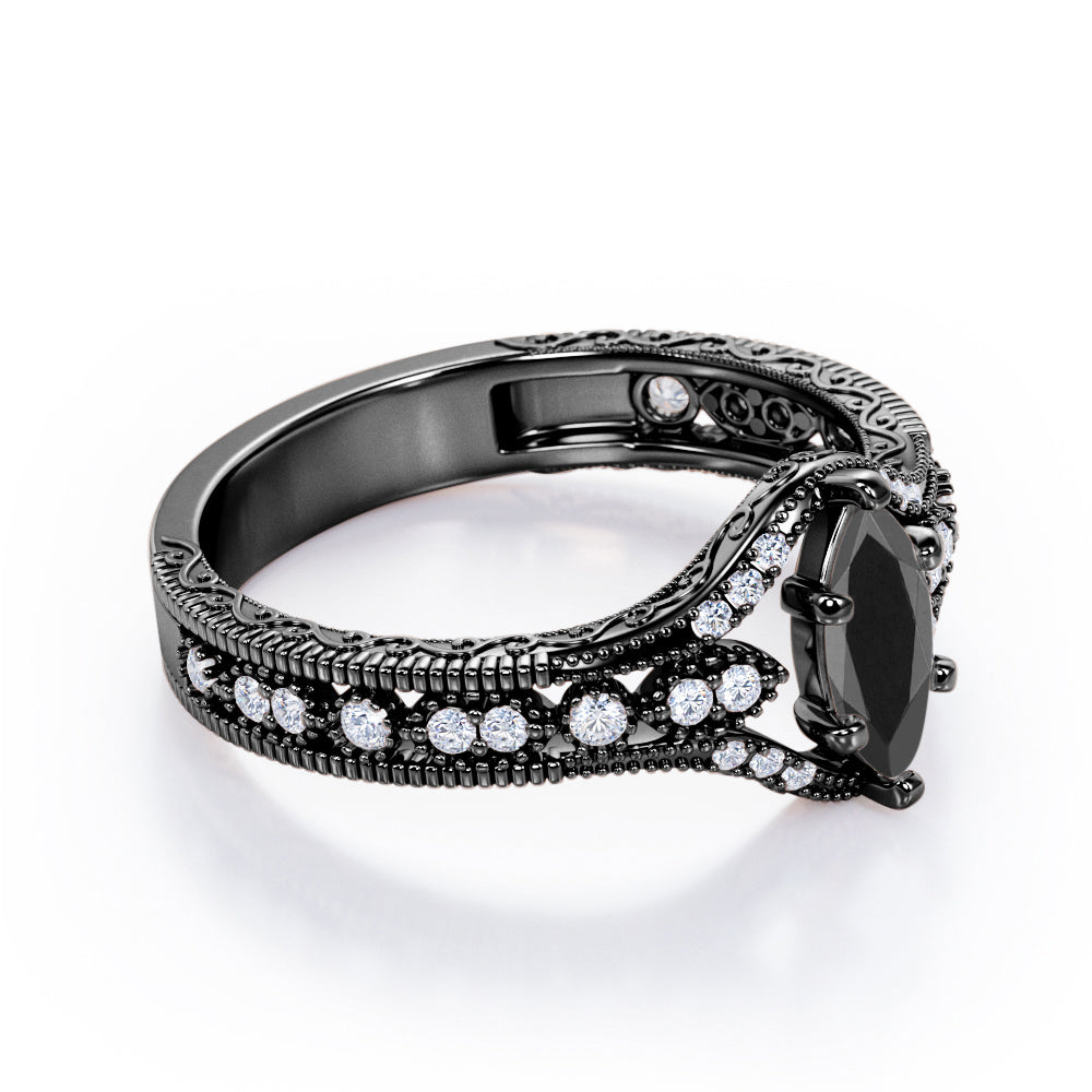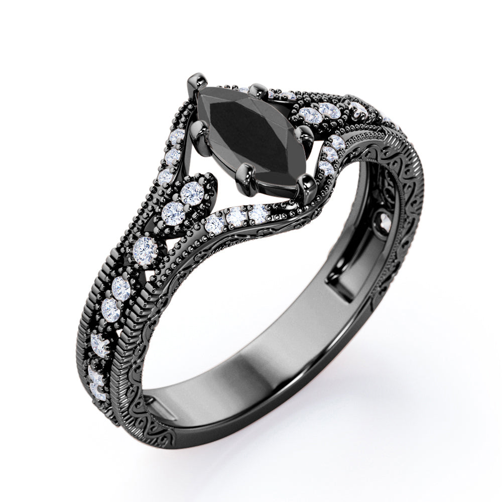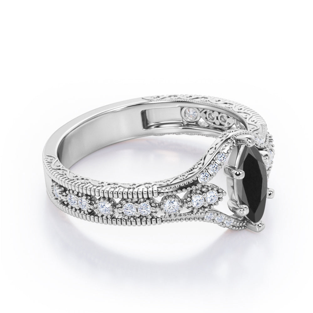 Unique Six Prongs 1.25 Carat Marquise Cut Black Diamond Vintage Filigree Engagement Ring In White Gold