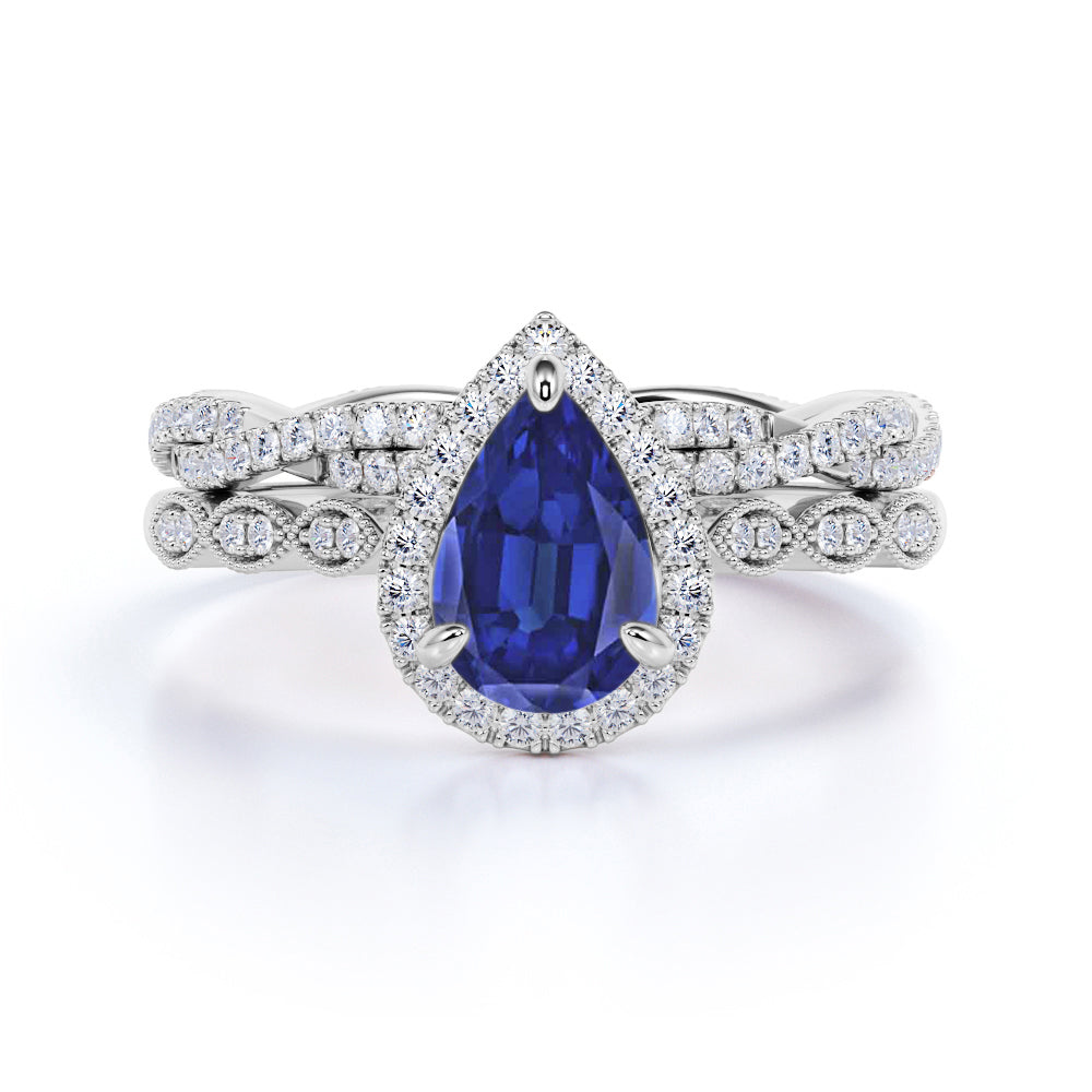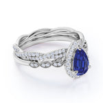 This is a beautiful antique pave set 2.25 Carat Pear Cut Sapphire and Diamond Halo Bridal Set with Infinity Band in White Gold. The pave set design bridal set is made with natural sapphire, real diamonds and on real gold. The sapphire bridal set can be made in either Rose, White or Yellow Gold, and can be customized to your choice of 10k, 14k or 18k Gold. As always, the order comes with jewelry certificate and 30 days full refund policy.